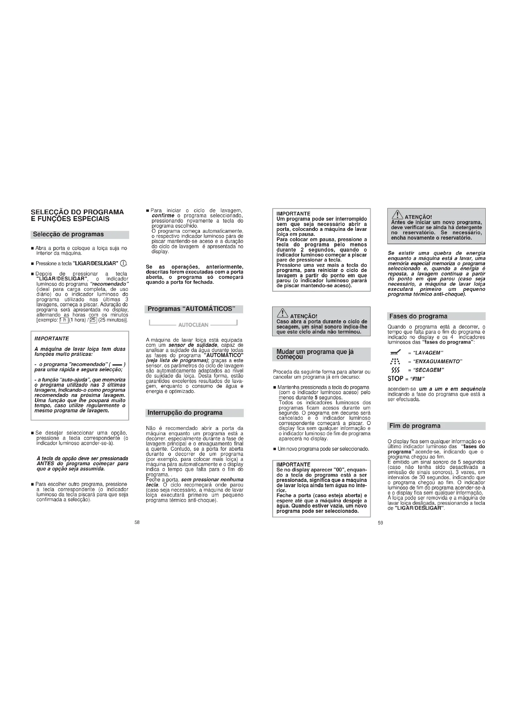 IMPORTANTE Um programa pode ser interrompido sem que seja necessário abrir a porta, colocando a máquina de lavar loiça em pausa. Para colocar em pausa, pressione a tecla do programa pelo menos durante 2 segundos, quando o indicador luminoso começar a piscar pare de pressionar a tecla. Pressione uma vez mais a tecla do programa, para reiniciar o ciclo de lavagem a partir do ponto em que parou (o indicador luminoso parará de piscar mantendo-se aceso). ATENÇÃO! Caso abra a porta durante o ciclo de secagem, um sinal sonoro indica-lhe que este ciclo ainda não terminou. Mudar um programa que já começou Proceda da seguinte forma para alterar ou cancelar um programa já em decurso: ■ Mantenha pressionada a tecla do progama (com o indicador luminoso aceso) pelo menos durante 5 segundos. Todos os indicadores luminosos dos programas ficam acesos durante um segundo. O programa em decurso será cancelado e o indicador luminoso correspondente começará a piscar. O display fica sem qualquer informação e o indicador luminoso de fim de programa aparecerá no display. ■ Um novo programa pode ser seleccionado. IMPORTANTE Se no display aparecer "00", enquan- do a tecla do programa está a ser pressionada, significa que a máquina de lavar loiça ainda tem água no inte- rior. Feche a porta (caso esteja aberta) e espere até que a máquina despeje a àgua. Quando estiver vazia, um novo programa pode ser seleccionado. ATENÇÃO! Antes de iniciar um novo programa, deve verificar se ainda há detergente no reservatório. Se necessário, encha novamente o reservatório. Se existir uma quebra de energia enquanto a máquina está a lavar, uma memória especial memoriza o programa seleccionado e, quando a energia é reposta, a lavagem continua a partir do ponto em que parou (caso seja necessário, a máquina de lavar loiça executará primeiro um pequeno programa térmico anti-choque). Fases do programa Quando o programa está a decorrer, o tempo que falta para o fim do programa é indicado no display e os 4 indicadores luminosos das “fases do programa”: = “LAVAGEM” = “ENXAGUAMENTO” = “SECAGEM” STOP = “FIM” acendem-se um a um e em sequência indicando a fase do programa que está a ser efectuada. Fim de programa O display fica sem qualquer informação e o último indicador luminoso das “fases do programa” acende-se, indicando que o programa chegou ao fim. É emitido um sinal sonoro de 5 segundos (caso não tenha sido desactivada a emissão de sinais sonoros), 3 vezes, em intervalos de 30 segundos, indicando que o programa chegou ao fim. O indicador luminoso de fim do programa acender-se-à e o display fica sem qualquer informação. A loiça pode ser removida e a máquina de lavar loiça desligada, pressionando a tecla de "LIGAR/DESLIGAR".SINAL AUTOMÁTICO DE ANOMALIA
