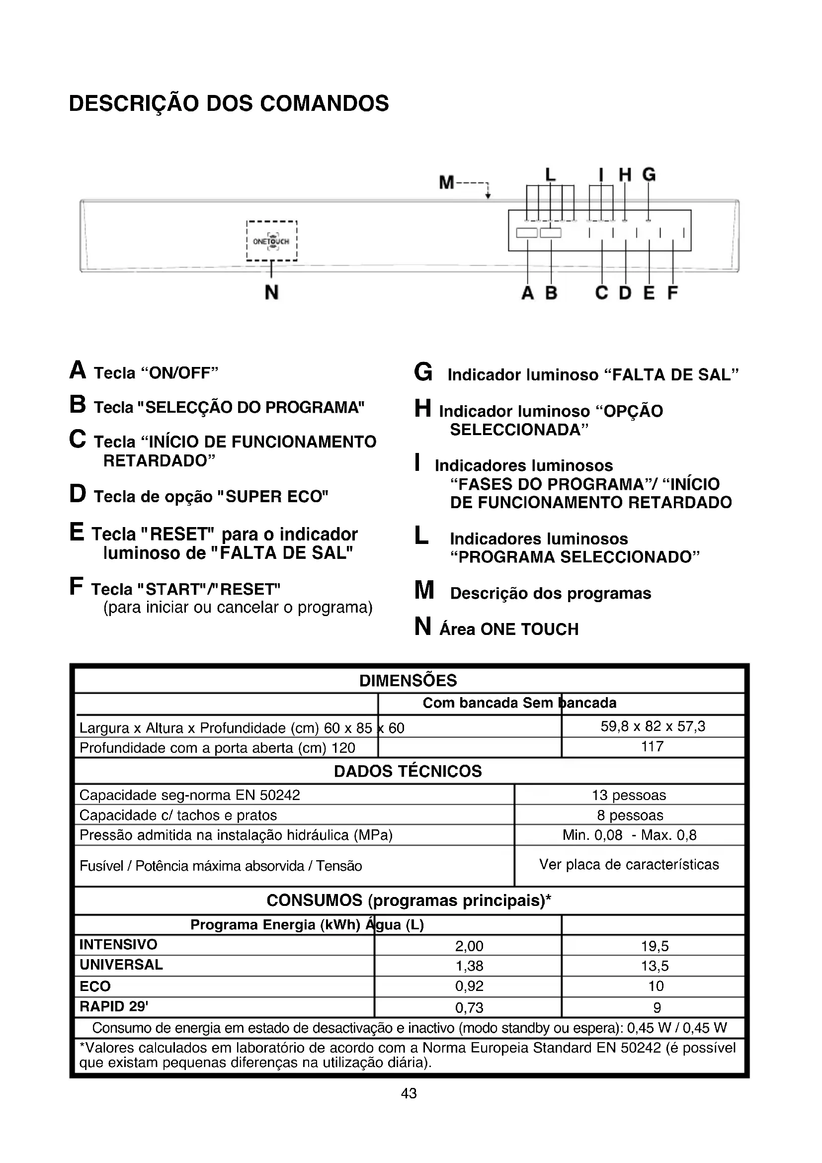 A Tecla “ON/OFF” B Tecla "SELECÇÃO DO PROGRAMA" C Tecla “INÍCIO DE FUNCIONAMENTO RETARDADO” D Tecla de opção "SUPER ECO" E Tecla "RESET" para o indicador luminoso de "FALTA DE SAL" F Tecla "START"/"RESET" (para iniciar ou cancelar o programa) G Indicador luminoso “FALTA DE SAL” H Indicador luminoso “OPÇÃO SELECCIONADA” I Indicadores luminosos
