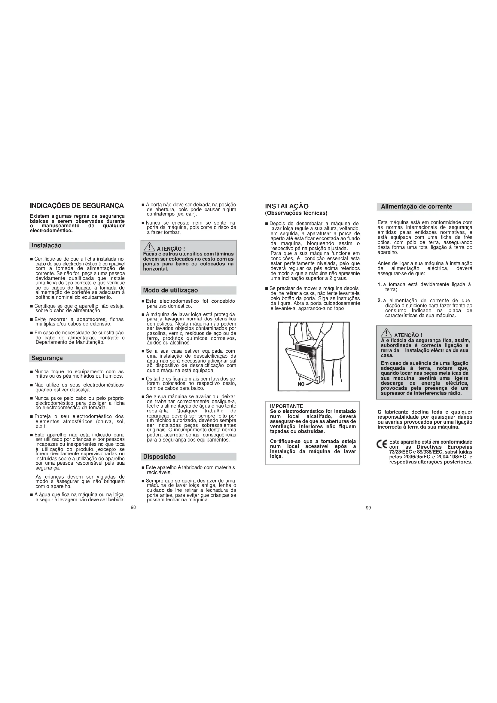 Existem algumas regras de segurança básicas a serem observadas durante o manuseamento de qualquer electrodoméstico. Instalação ■ Certifique-se de que a ficha instalada no cabo do seu electrodoméstico é compatível com a tomada de alimentação de corrente. Se não for, peça a uma pessoa devidamente qualificada que instale uma ficha do tipo correcto e que verifique se os cabos de ligação à tomada de alimentação de corrente se adequam à potência nominal do equipamento. ■ Certifique-se que o aparelho não esteja sobre o cabo de alimentação. ■ Evite recorrer a adaptadores, fichas múltiplas e/ou cabos de extensão. ■ Em caso de necessidade de substitução do cabo de alimentação, contacte o Departamento de Manutenção. Segurança ■ Nunca toque no equipamento com as mãos ou os pés molhados ou húmidos. ■ Não utilize os seus electrodomésticos quando estiver descalça. ■ Nunca puxe pelo cabo ou pelo próprio electrodoméstico para desligar a ficha do electrodoméstico da tomada. ■ Proteja o seu electrodoméstico dos elementos atmosféricos (chuva, sol, etc.). ■ Este aparelho não está indicado para ser utilizado por crianças e por pessoas incapazes ou inexperientes no que toca à utilização do produto, excepto se forem devidamente supervisionadas ou instruídas sobre a utilização do aparelho por uma pessoa responsável pela sua segurança. As crianças devem ser vigiadas de modo a assegurar que não brinquem com o aparelho. ■ A água que fica na máquina ou na loiça a seguir à lavagem não deve ser bebida. ■ A porta não deve ser deixada na posição de abertura, pois pode causar algum contratempo (ex. cair). ■ Nunca se encoste nem se sente na porta da máquina, pois corre o risco de a fazer tombar. ATENÇÃO ! Facas e outros utensílios com lâminas devem ser colocados no cesto com as pontas para baixo ou colocados na horizontal. Modo de utilização ■ Este electrodomestico foi concebido para uso doméstico. ■ A máquina de lavar loiça está protegida para a lavagem normal dos utensílios domésticos. Nesta máquina não podem ser lavados objectos contaminados por gasolina, verniz, resíduos de aço ou de ferro, produtos químicos corrosivos, ácidos ou alcalinos. ■ Se a sua casa estiver equipada com uma instalação de descalcificação da água não será necessário adicionar sal ao dispositivo de descalcificação com que a máquina está equipada. ■ Os talheres ficarão mais bem lavados se forem colocados no respectivo cesto, com os cabos para baixo. ■ Se a sua máquina se avariar ou deixar de trabalhar correctamente desligue-a, feche a alimentação de água e não tente repará-la. Qualquer trabalho de reparação deverá ser sempre feito por um técnico autorizado, devendo sempre ser instaladas peças sobressalentes originais. O incumprimento desta norma poderá acarretar sérias consequências para a segurança dos equipamentos. Disposição ■ Este aparelho é fabricado com materiais recicláveis. ■ Sempre que se queira desfazer de uma máquina de lavar loiça antiga, tenha o cuidado de lhe retirar a fechadura da porta antes, para evitar que crianças se possam fechar na máquina.101 Ligação ao sistema de esgoto de água ■ Ligue a mangueira de esgoto de água ao sistema de esgoto de água, tendo o cuidado de não deixar que a mangueira fique torcida (fig. 4). ■ O sistema de esgoto fixo deverá ter um diâmetro interno de, pelo menos, 4 cm, devendo ficar a uma altura mínima do chão de 40 cm. ■ Recomendamos a utilização de sifões anti-odores (fig. 4 X). ■ Se necessário, poderá prolongar a mangueira de esgoto da água até ao máximo de 2,5 m de comprimento, tendo porém o cuidade de nunca colocar a mangueira a uma altura superior a 85 cm do chão. A extensão da mangueira é fornecida pelo serviço Após Venda. ■ A extremidade curva da mangueira de esgoto poderá ser apoiada à borda de um lavatório (a fim de evitar o refluxo da água durante o programa de lavagem, deverá sempre certificar-se de que a extremidade da mangueira não se encontra dentro de água. Vide a fig. 4 Y). ■ Sempre que a máquina seja instalada sob uma bancada continua a curva deverá ser fixada imediatamente abaixo da bancada, num ponto o mais alto possível (fig. 4 Z). ■ Ao proceder à instalação da máquina certifique-se sempre de que nem a mangueira de entrada de água nem a de esgoto de água fiquem dobradas ou torcidas.