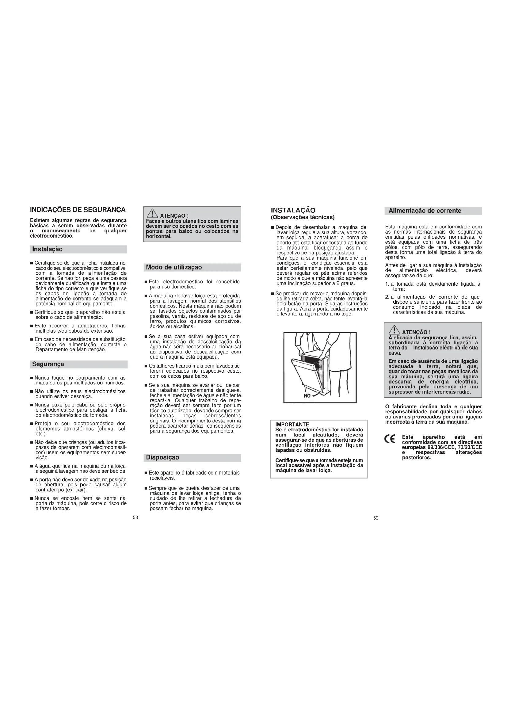 Existem algumas regras de segurança básicas a serem observadas durante o manuseamento de qualquer electrodoméstico. Instalação ■ Certifique-se de que a ficha instalada no cabo do seu electrodoméstico é compatível com a tomada de alimentação de corrente. Se não for, peça a uma pessoa devidamente qualificada que instale uma ficha do tipo correcto e que verifique se os cabos de ligação à tomada de alimentação de corrente se adequam à potência nominal do equipamento. ■ Certifique-se que o aparelho não esteja sobre o cabo de alimentação. ■ Evite recorrer a adaptadores, fichas múltiplas e/ou cabos de extensão. ■ Em caso de necessidade de substitução do cabo de alimentação, contacte o Departamento de Manutenção. Segurança ■ Nunca toque no equipamento com as mãos ou os pés molhados ou húmidos. ■ Não utilize os seus electrodomésticos quando estiver descalça. ■ Nunca puxe pelo cabo ou pelo próprio electrodoméstico para desligar a ficha do electrodoméstico da tomada. ■ Proteja o seu electrodoméstico dos elementos atmosféricos (chuva, sol, etc.). ■ Não deixe que crianças (ou adultos inca- pazes de operarem com electrodomésti- cos) usem os equipamentos sem super- visão. ■ A água que fica na máquina ou na loiça a seguir à lavagem não deve ser bebida. ■ A porta não deve ser deixada na posição de abertura, pois pode causar algum contratempo (ex. cair). ■ Nunca se encoste nem se sente na porta da máquina, pois corre o risco de a fazer tombar. ATENÇÃO ! Facas e outros utensílios com lâminas devem ser colocados no cesto com as pontas para baixo ou colocados na horizontal. Modo de utilização ■ Este electrodomestico foi concebido para uso doméstico. ■ A máquina de lavar loiça está protegida para a lavagem normal dos utensílios domésticos. Nesta máquina não podem ser lavados objectos contaminados por gasolina, verniz, resíduos de aço ou de ferro, produtos químicos corrosivos, ácidos ou alcalinos. ■ Se a sua casa estiver equipada com uma instalação de descalcificação da água não será necessário adicionar sal ao dispositivo de descalcificação com que a máquina está equipada. ■ Os talheres ficarão mais bem lavados se forem colocados no respectivo cesto, com os cabos para baixo. ■ Se a sua máquina se avariar ou deixar de trabalhar correctamente desligue-a, feche a alimentação de água e não tente repará-la. Qualquer trabalho de repa- ração deverá ser sempre feito por um técnico autorizado, devendo sempre ser instaladas peças sobressalentes originais. O incumprimento desta norma poderá acarretar sérias consequências para a segurança dos equipamentos. Disposição ■ Este aparelho é fabricado com materiais recicláveis. ■ Sempre que se queira desfazer de uma máquina de lavar loiça antiga, tenha o cuidado de lhe retirar a fechadura da porta antes, para evitar que crianças se possam fechar na máquina.61 Ligação ao sistema de esgoto de água ■ Ligue a mangueira de esgoto de água ao sistema de esgoto de água, tendo o cuidado de não deixar que a mangueira fique torcida (fig. 4). ■ O sistema de esgoto fixo deverá ter um diâmetro interno de, pelo menos, 4 cm, devendo ficar a uma altura mínima do chão de 40 cm. ■ Recomendamos a utilização de sifões anti-odores (fig. 4 X). ■ Se necessário, poderá prolongar a mangueira de esgoto da água até ao máximo de 2,5 m de comprimento, tendo porém o cuidade de nunca colocar a mangueira a uma altura superior a 85 cm do chão. A extensão da mangueira é fornecida pelo serviço Após Venda. ■ A extremidade curva da mangueira de esgoto poderá ser apoiada à borda de um lavatório (a fim de evitar o refluxo da água durante o programa de lavagem, deverá sempre certificar-se de que a extremidade da mangueira não se encontra dentro de água. Vide a fig. 4 Y). ■ Sempre que a máquina seja instalada sob uma bancada continua a curva deverá ser fixada imediatamente abaixo da bancada, num ponto o mais alto possível (fig. 4 Z). ■ Ao proceder à instalação da máquina certifique-se sempre de que nem a mangueira de entrada de água nem a de esgoto de água fiquem dobradas ou torcidas.