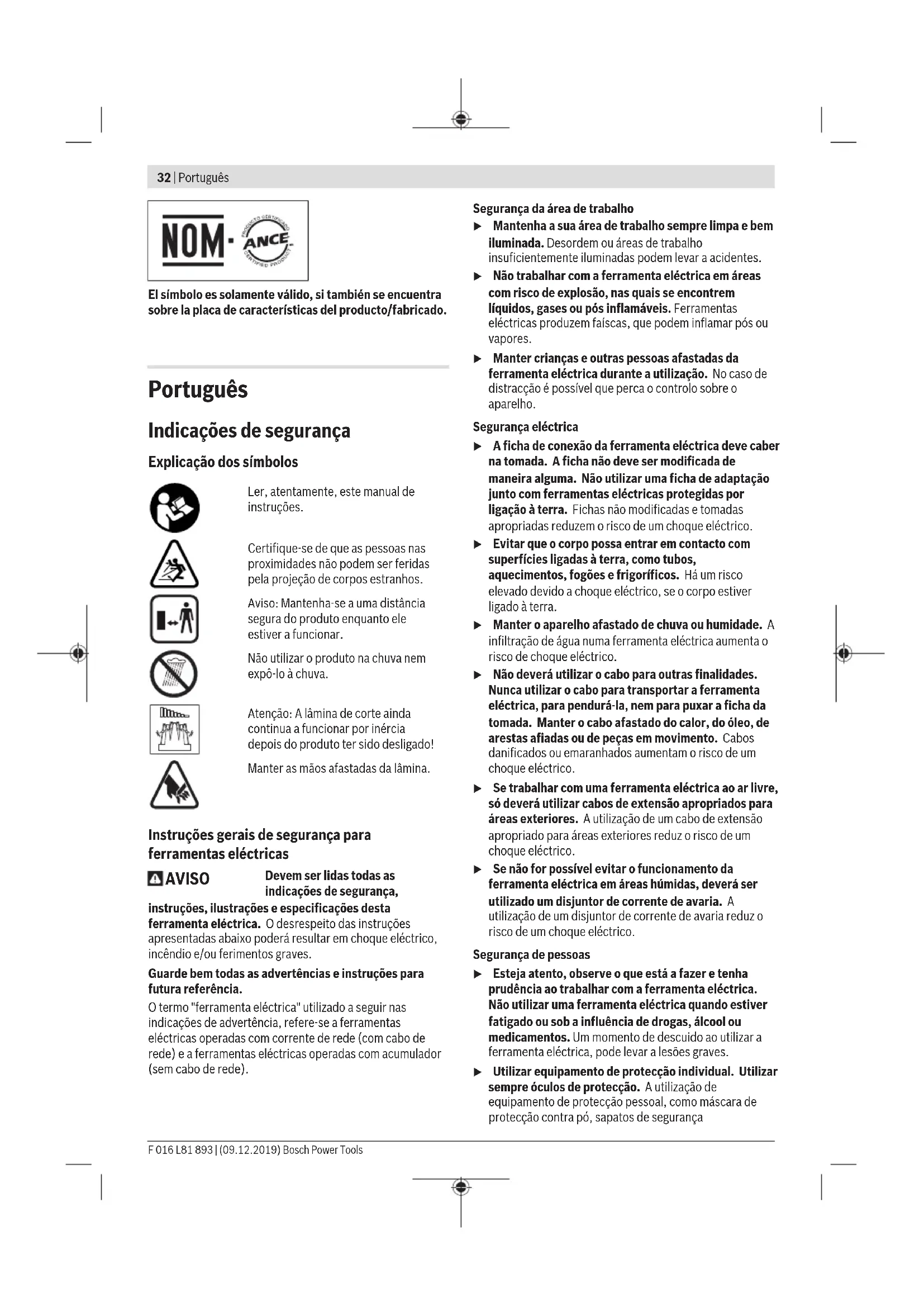 Santiago de Chile Tel.: (56) 02 782 0200 www.bosch.cl Ecuador Robert Bosch Sociedad Anónima Av. Rodrigo Chávez Gonzalez, Parque Empresarial Colón, Edif. Coloncorp Piso 1 Local 101-102 Guayaquil Tel.: (593) 3719100ext.214-215 E-mail: herramientas.bosch4@ec.bosch.com www.boschherramientas.com.ec México Robert Bosch S. de R.L. de C.V. Calle Robert Bosch No. 405 C.P. 50071 Zona Industrial, Toluca - Estado de México Tel.: (52) 55 528430-62 Tel.: 800 6271286 www.bosch-herramientas.com.mx Perú Robert Bosch S.A.C. Av. Primavera 781 Piso 2, Urb. Chacarilla San Borja Lima Tel.: (51) 1 706 1100 www.bosch.com.pe Venezuela Robert Bosch S.A. Calle Vargas con Buen Pastor, Edif. Alba, P-1, Boleita Norte, Caracas 1071 Tel.: (58) 212 207-4511 www.boschherramientas.com.ve Transporte Los acumuladores de iones de litio incorporados están suje- tos a los requerimientos estipulados en la legislación sobre mercancías peligrosas. Los acumuladores pueden ser trans- portados por carretera por el usuario sin más imposiciones. En el envío por terceros (p.ej., transporte aéreo o por agen- cia de transportes) deberán considerarse las exigencias es- peciales en cuanto a su embalaje e identificación. En este ca- so deberá recurrirse a los servicios de un experto en mercan- cías peligrosas al preparar la pieza para su envío. Eliminación Los productos, acumuladores, accesorios y embalajes deberán someterse a un proceso de recuperación que respete el medio ambiente. ¡No arroje los productos, acumuladores o pilas a la basura! Sólo para los países de laUE: Los productos inservibles, así como los acumuladores/pilas defectuosos o agotados, se deberán acumular por separado para ser sometidos a un reciclaje ecológico tal como lo mar- can las Directivas Europeas 2012/19/UE y 2006/66/CE, respectivamente. Acumuladores/pilas: Iones de Litio: Por favor, observe las indicaciones en el apartado Transpor- te (ver "Transporte", Página31). u Los acumuladores incorporados que deban ser dese- chados solo los deberá desmontar personal especiali- zado. Al abrir la semicarcasa puede que se dañe o inutili- ce el producto. Antes de desmontar el acumulador deje funcionando el pro- ducto hasta que el acumulador se haya descargado del todo. Desenrosque los tornillos de la carcasa y quite la semicarca- sa, para extraer el acumulador. A fin de evitar un cortocircui- to, desconecte uno tras otro los conectores del acumulador y aísle luego los polos. Incluso tras haber descargado del to- do el acumulador éste dispone todavía de una capacidad re- sidual capaz de generar corriente en caso de cortocircuito. Bosch Power Tools F 016 L81 893 | (09.12.2019)32 | Português El símbolo es solamente válido, si también se encuentra sobre la placa de características del producto/fabricado. Português Indicações de segurança Explicação dos símbolos Ler, atentamente, este manual de instruções. Certifique-se de que as pessoas nas proximidades não podem ser feridas pela projeção de corpos estranhos. Aviso: Mantenha-se a uma distância segura do produto enquanto ele estiver a funcionar. Não utilizar o produto na chuva nem expô-lo à chuva. Atenção: A lâmina de corte ainda continua a funcionar por inércia depois do produto ter sido desligado! Manter as mãos afastadas da lâmina. Instruções gerais de segurança para ferramentas eléctricas AVISO Devem ser lidas todas as indicações de segurança, instruções, ilustrações e especificações desta ferramenta eléctrica. O desrespeito das instruções apresentadas abaixo poderá resultar em choque eléctrico, incêndio e/ou ferimentos graves. Guarde bem todas as advertências e instruções para futura referência. O termo "ferramenta eléctrica" utilizado a seguir nas indicações de advertência, refere‑se a ferramentas eléctricas operadas com corrente de rede (com cabo de rede) e a ferramentas eléctricas operadas com acumulador (sem cabo de rede). Segurança da área de trabalho u Mantenha a sua área de trabalho sempre limpa e bem iluminada. Desordem ou áreas de trabalho insuficientemente iluminadas podem levar a acidentes. u Não trabalhar com a ferramenta eléctrica em áreas com risco de explosão, nas quais se encontrem líquidos, gases ou pós inflamáveis. Ferramentas eléctricas produzem faíscas, que podem inflamar pós ou vapores. u Manter crianças e outras pessoas afastadas da ferramenta eléctrica durante a utilização. No caso de distracção é possível que perca o controlo sobre o aparelho. Segurança eléctrica u A ficha de conexão da ferramenta eléctrica deve caber na tomada. A ficha não deve ser modificada de maneira alguma. Não utilizar uma ficha de adaptação junto com ferramentas eléctricas protegidas por ligação à terra. Fichas não modificadas e tomadas apropriadas reduzem o risco de um choque eléctrico. u Evitar que o corpo possa entrar em contacto com superfícies ligadas à terra, como tubos, aquecimentos, fogões e frigoríficos. Há um risco elevado devido a choque eléctrico, se o corpo estiver ligado à terra. u Manter o aparelho afastado de chuva ou humidade. A infiltração de água numa ferramenta eléctrica aumenta o risco de choque eléctrico. u Não deverá utilizar o cabo para outras finalidades. Nunca utilizar o cabo para transportar a ferramenta eléctrica, para pendurá‑la, nem para puxar a ficha da tomada. Manter o cabo afastado do calor, do óleo, de arestas afiadas ou de peças em movimento. Cabos danificados ou emaranhados aumentam o risco de um choque eléctrico. u Se trabalhar com uma ferramenta eléctrica ao ar livre, só deverá utilizar cabos de extensão apropriados para áreas exteriores. A utilização de um cabo de extensão apropriado para áreas exteriores reduz o risco de um choque eléctrico. u Se não for possível evitar o funcionamento da ferramenta eléctrica em áreas húmidas, deverá ser utilizado um disjuntor de corrente de avaria. A utilização de um disjuntor de corrente de av