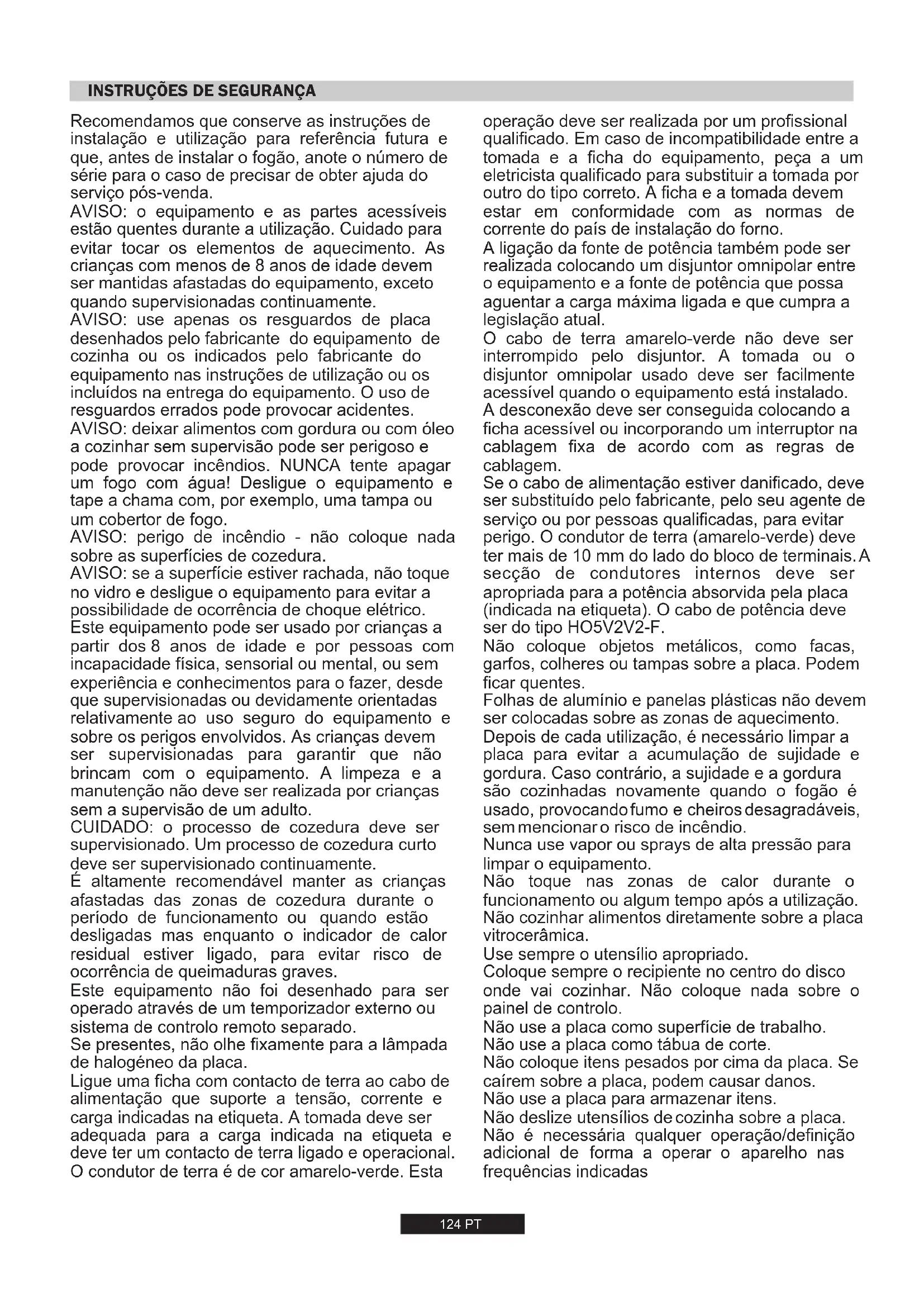operação deve ser realizada por um profissional qualificado. Em caso de incompatibilidade entre a tomada e a ficha do equipamento, peça a um eletricista qualificado para substituir a tomada por outro do tipo correto. A ficha e a tomada devem estar em conformidade com as normas de corrente do país de instalação do forno. O cabo de terra amarelo-verde não deve ser interrompido pelo disjuntor. A tomada ou o disjuntor omnipolar usado deve ser facilmente acessível quando o equipamento está instalado. A ligação da fonte de potência também pode ser realizada colocando um disjuntor omnipolar entre o equipamento e a fonte de potência que possa aguentar a carga máxima ligada e que cumpra a legislação atual. Se o cabo de alimentação estiver danificado, deve ser substituído pelo fabricante, pelo seu agente de serviço ou por pessoas qualificadas, para evitar perigo. O condutor de terra (amarelo-verde) deve ter mais de 10 mm do lado do bloco de terminais. A secção de condutores internos deve ser apropriada para a potência absorvida pela placa (indicada na etiqueta). O cabo de potência deve ser do tipo HO5V2V2-F. A desconexão deve ser conseguida colocando a ficha acessível ou incorporando um interruptor na cablagem fixa de acordo com as regras de cablagem. Folhas de alumínio e panelas plásticas não devem ser colocadas sobre as zonas de aquecimento. Não cozinhar alimentos diretamente sobre a placa vitrocerâmica. Não coloque objetos metálicos, como facas, garfos, colheres ou tampas sobre a placa. Podem ficar quentes. Use sempre o utensílio apropriado. Coloque sempre o recipiente no centro do disco onde vai cozinhar. Não coloque nada sobre o painel de controlo. Nunca use vapor ou sprays de alta pressão para limpar o equipamento. Não use a placa como superfície de trabalho. Não use a placa como tábua de corte. Não toque nas zonas de calor durante o funcionamento ou algum tempo após a utilização. Não use a placa para armazenar itens. Não coloque itens pesados por cima da placa. Se caírem sobre a placa, podem causar danos. Depois de cada utilização, é necessário limpar a placa para evitar a acumulação de sujidade e gordura. Caso contrário, a sujidade e a gordura são cozinhadas novamente quando o fogão é usado, provocando fumo e cheiros desagradáveis, sem mencionar o risco de incêndio. Não deslize utensílios de cozinha sobre a placa. Não é necessária qualquer operação/definição adicional de forma a operar o aparelho nas frequências indicadas