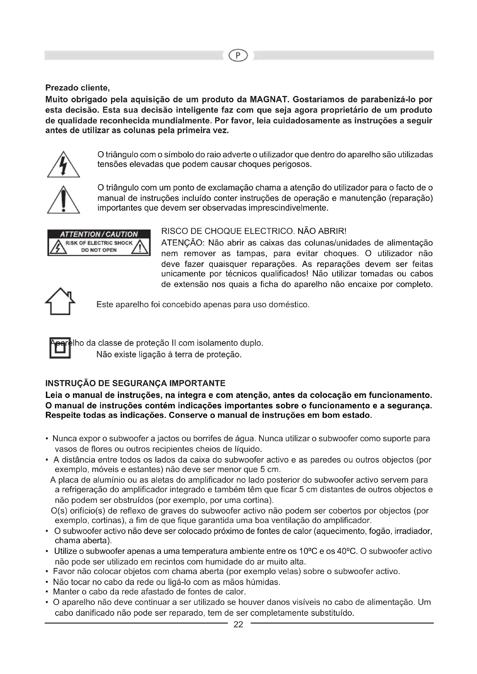 Configuración: Bassreflex subwoofer, ‘Frontfire’ Componentes: Unidad de largo recorrido de 30 cm Potencia de salida RMS/Máx.: 140 / 280 vatios Gama de frecuencias: 20 – 200 Hz Frecuencia de separación: 40 – 120 Hz regulable Dimensiones (an x al x pr): 355 x 475 x 435 mm Accesorios: Cable de la red RESERVADOS LOS DERECHOS DE REALIZAR CAMBIOS TÉCNICOS.22 Prezado cliente, Muito obrigado pela aquisição de um produto da MAGNAT. Gostaríamos de parabenizá-lo por esta decisão. Esta sua decisão inteligente faz com que seja agora proprietário de um produto de qualidade reconhecida mundialmente. Por favor, leia cuidadosamente as instruções a seguir antes de utilizar as colunas pela primeira vez. O triângulo com o símbolo do raio adverte o utilizador que dentro do aparelho são utilizadas tensões elevadas que podem causar choques perigosos. O triângulo com um ponto de exclamação chama a atenção do utilizador para o facto de o manual de instruções incluído conter instruções de operação e manutenção (reparação) importantes que devem ser observadas imprescindivelmente. RISCO DE CHOQUE ELECTRICO. NÃO ABRIR! ATENÇÃO: Não abrir as caixas das colunas/unidades de alimentação nem remover as tampas, para evitar choques. O utilizador não deve fazer quaisquer reparações. As reparações devem ser feitas unicamente por técnicos qualificados! Não utilizar tomadas ou cabos de extensão nos quais a ficha do aparelho não encaixe por completo. Este aparelho foi concebido apenas para uso doméstico. Aparelho da classe de proteção II com isolamento duplo. Não existe ligação à terra de proteção.