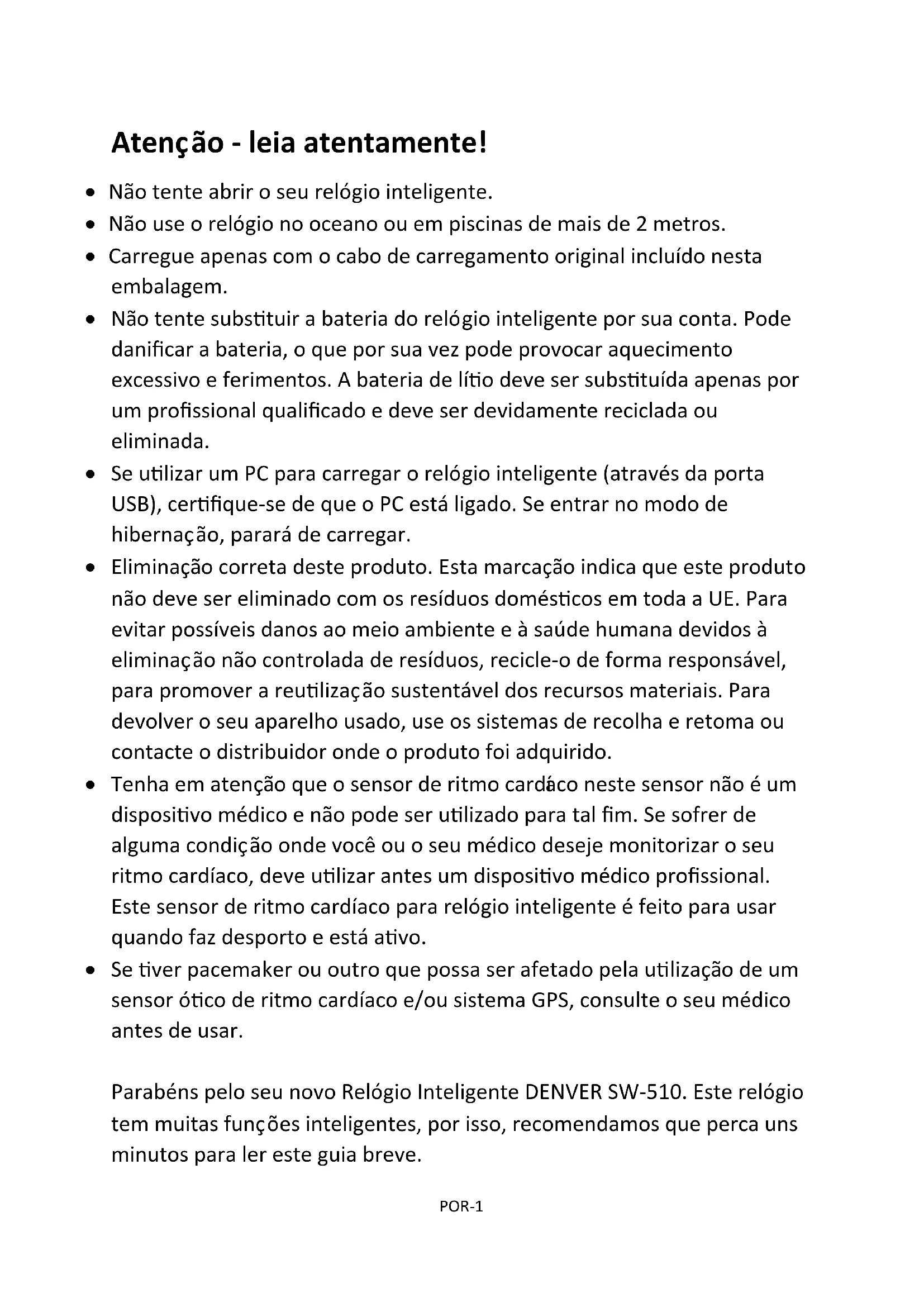 www.facebook.com/denverelectronics PORTUGUÊSPOR-1 Atenção - leia atentamente! Não tente abrir o seu relógio inteligente. Não use o relógio no oceano ou em piscinas de mais de 2 metros. Carregue apenas com o cabo de carregamento original incluído nesta embalagem. Não tente substituir a bateria do relógio inteligente por sua conta. Pode danificar a bateria, o que por sua vez pode provocar aquecimento excessivo e ferimentos. A bateria de lítio deve ser substituída apenas por um profissional qualificado e deve ser devidamente reciclada ou eliminada. Se utilizar um PC para carregar o relógio inteligente (através da porta USB), certifique-se de que o PC está ligado. Se entrar no modo de hibernação, parará de carregar. Eliminação correta deste produto. Esta marcação indica que este produto não deve ser eliminado com os resíduos domésticos em toda a UE. Para evitar possíveis danos ao meio ambiente e à saúde humana devidos à eliminação não controlada de resíduos, recicle-o de forma responsável, para promover a reutilização sustentável dos recursos materiais. Para devolver o seu aparelho usado, use os sistemas de recolha e retoma ou contacte o distribuidor onde o produto foi adquirido. Tenha em atenção que o sensor de ritmo cardíaco neste sensor não é um dispositivo médico e não pode ser utilizado para tal fim. Se sofrer de alguma condição onde você ou o seu médico deseje monitorizar o seu ritmo cardíaco, deve utilizar antes um dispositivo médico profissional. Este sensor de ritmo cardíaco para relógio inteligente é feito para usar quando faz desporto e está ativo. Se tiver pacemaker ou outro que possa ser afetado pela utilização de um sensor ótico de ritmo cardíaco e/ou sistema GPS, consulte o seu médico antes de usar. Parabéns pelo seu novo Relógio Inteligente DENVER SW-510. Este relógio tem muitas funções inteligentes, por isso, recomendamos que perca uns minutos para ler este guia breve.POR-2 Características principais: Relógio inteligente Bluetooth com função GPS & sensor de ritmo cardíaco Modo multidesportivo (corrida, caminhada, escalada, ciclismo e corrida indoor) Monitorize o seu desempenho desportivo, visualize o ritmo cardíaco Mostra clima e temperatura Use como pedómetro para monitorizar os seus passos diários e a qualidade do sono Sincronize a agenda telefónica e atenda ou rejeite chamadas diretamente no relógio Visualização de SMS, e-mails, eventos de calendário e atividade de redes sociais Controlo remoto de reprodução de música, captura remota de fotos no smartphone Bateria de polímero de lítio 500mAh com 7-10 dias em standby Compatível com iOS7 ou superior e Android 4.4 e superior Visão Geral Relógio Inteligente