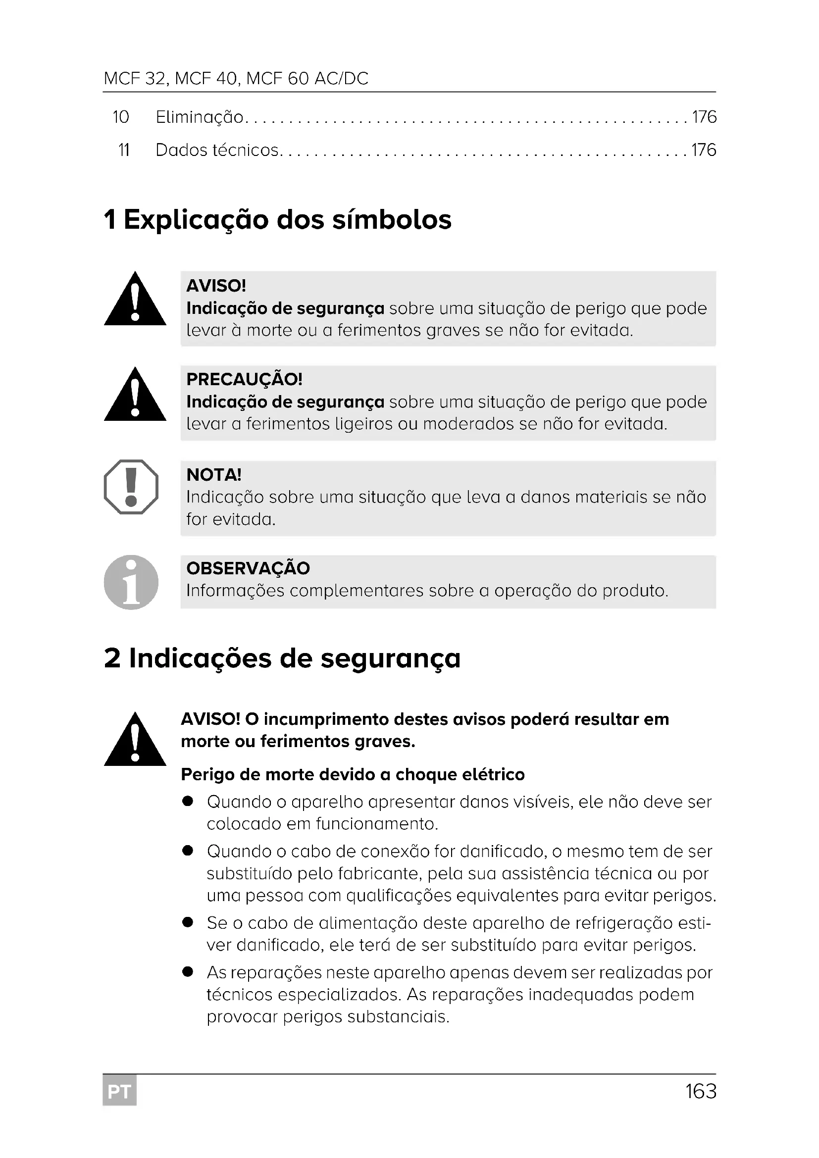 AVISO! O incumprimento destes avisos poderá resultar em morte ou ferimentos graves. Perigo de morte devido a choque elétrico Quando o aparelho apresentar danos visíveis, ele não deve ser colocado em funcionamento. Quando o cabo de conexão for danificado, o mesmo tem de ser substituído pelo fabricante, pela sua assistência técnica ou por uma pessoa com qualificações equivalentes para evitar perigos. Se o cabo de alimentação deste aparelho de refrigeração esti- ver danificado, ele terá de ser substituído para evitar perigos. As reparações neste aparelho apenas devem ser realizadas por técnicos especializados. As reparações inadequadas podem provocar perigos substanciais. AVISO! Indicação de segurança sobre uma situação de perigo que pode levar à morte ou a ferimentos graves se não for evitada. PRECAUÇÃO! Indicação de segurança sobre uma situação de perigo que pode levar a ferimentos ligeiros ou moderados se não for evitada. NOTA! Indicação sobre uma situação que leva a danos materiais se não for evitada. OBSERVAÇÃO Informações complementares sobre a operação do produto. FR34-FR40-FR60_MCF32-MCF40-MCF60_OPM_EMEA16.book Seite 163 Donnerstag, 13. Februar 2020 3:51 15PT Indicações de segurança MCF 32, MCF 40, MCF 60 AC/DC