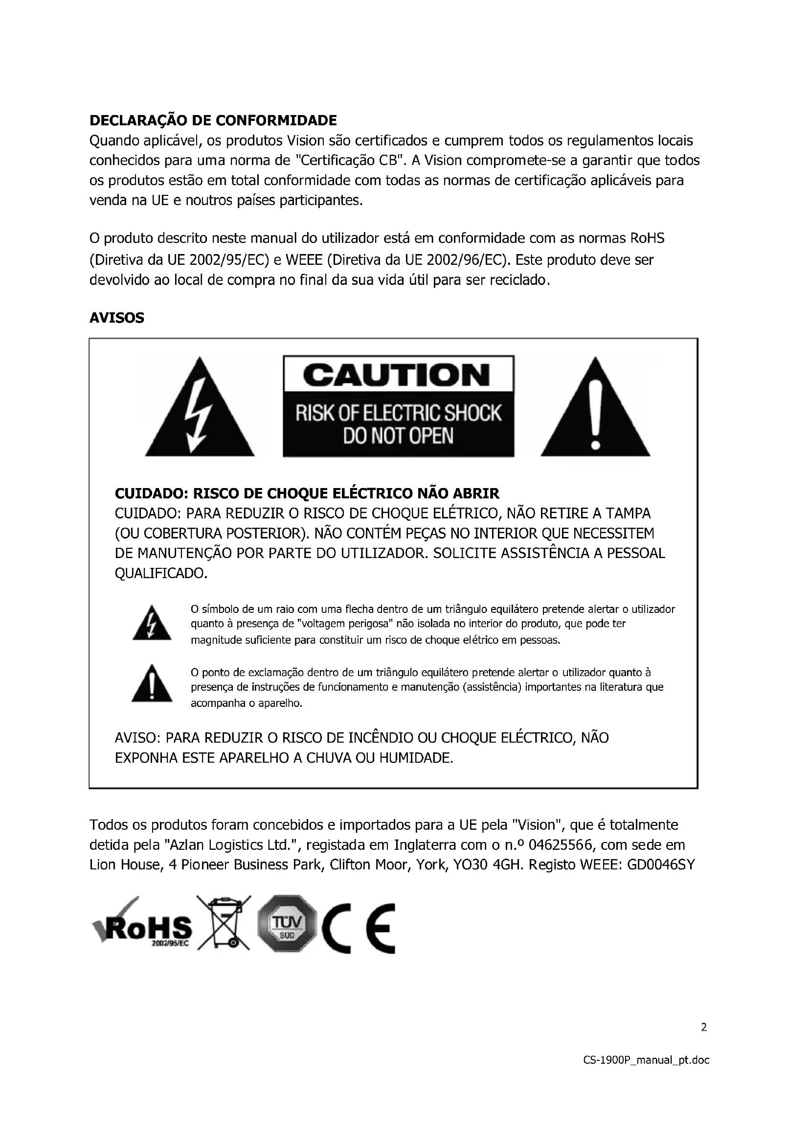 Quando aplicável, os produtos Vision são certificados e cumprem todos os regulamentos locais conhecidos para uma norma de "Certificação CB". A Vision compromete-se a garantir que todos os produtos estão em total conformidade com todas as normas de certificação aplicáveis para venda na UE e noutros países participantes. O produto descrito neste manual do utilizador está em conformidade com as normas RoHS (Diretiva da UE 2002/95/EC) e WEEE (Diretiva da UE 2002/96/EC). Este produto deve ser devolvido ao local de compra no final da sua vida útil para ser reciclado. AVISOS CUIDADO: RISCO DE CHOQUE ELÉCTRICO NÃO ABRIR CUIDADO: PARA REDUZIR O RISCO DE CHOQUE ELÉTRICO, NÃO RETIRE A TAMPA (OU COBERTURA POSTERIOR). NÃO CONTÉM PEÇAS NO INTERIOR QUE NECESSITEM DE MANUTENÇÃO POR PARTE DO UTILIZADOR. SOLICITE ASSISTÊNCIA A PESSOAL QUALIFICADO. O símbolo de um raio com uma flecha dentro de um triângulo equilátero pretende alertar o utilizador quanto à presença de "voltagem perigosa" não isolada no interior do produto, que pode ter magnitude suficiente para constituir um risco de choque elétrico em pessoas. O ponto de exclamação dentro de um triângulo equilátero pretende alertar o utilizador quanto à presença de instruções de funcionamento e manutenção (assistência) importantes na literatura que acompanha o aparelho. AVISO: PARA REDUZIR O RISCO DE INCÊNDIO OU CHOQUE ELÉCTRICO, NÃO EXPONHA ESTE APARELHO A CHUVA OU HUMIDADE. Todos os produtos foram concebidos e importados para a UE pela "Vision", que é totalmente detida pela "Azlan Logistics Ltd.", registada em Inglaterra com o n.º 04625566, com sede em Lion House, 4 Pioneer Business Park, Clifton Moor, York, YO30 4GH. Registo WEEE: GD0046SY3 CS-1900P_manual_pt.doc