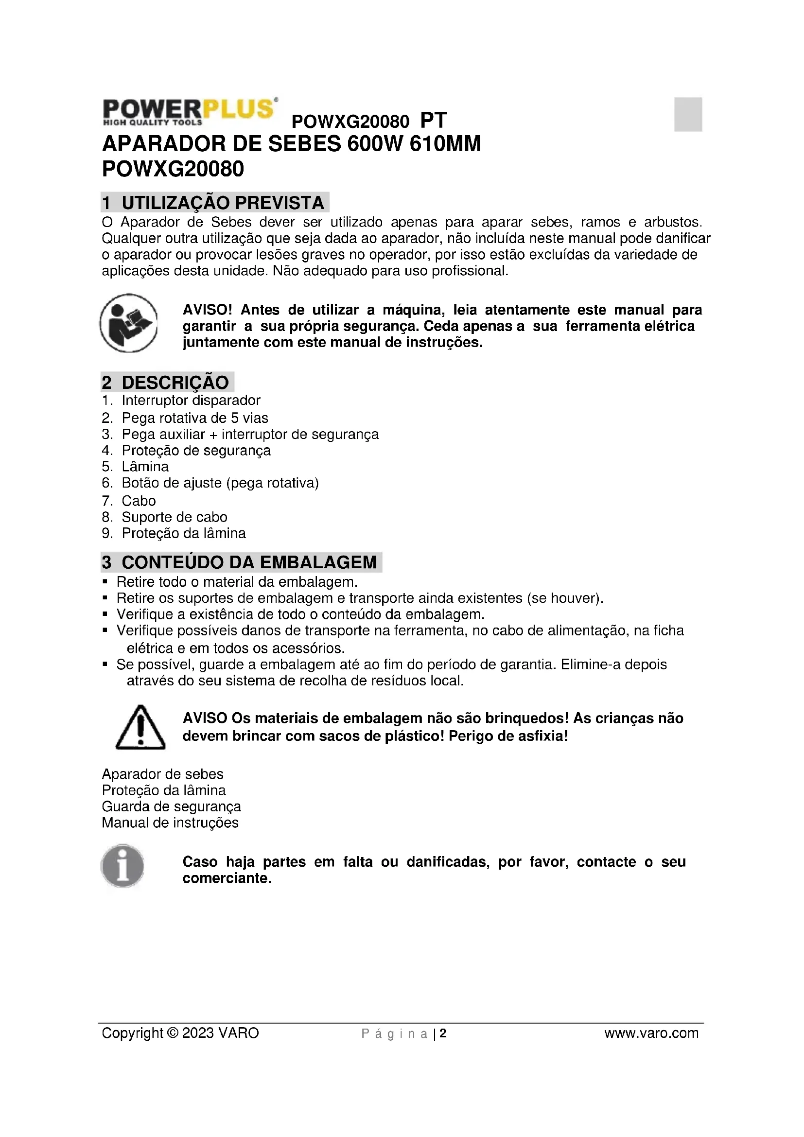 - Se possível, guarde a embalagem até ao fim do período de garantia. Elimine-a depois através do seu sistema de recolha de resíduos local. AVISO Os materiais de embalagem não são brinquedos! As crianças não devem brincar com sacos de plástico! Perigo de asfixia! Aparador de sebes Proteção da lâmina Guarda de segurança Manual de instruções Caso haja partes em falta ou danificadas, por favor, contacte o seu comerciante.POWXG20080 PT Copyright © 2023 VARO P á g i n a | 3 www.varo.com 4 SÍMBOLOS Neste manual e/ou na máquina são utilizados os seguintes símbolos: