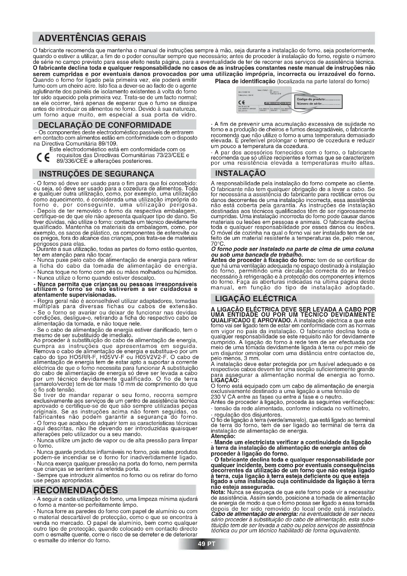 - O fabricante declina toda e qualquer responsabilidade por qualquer incidente, bem como por eventuais consequências decorrentes da utilização de um forno que não esteja ligado à terra, cuja ligação à terra esteja deficiente ou que esteja ligado a uma instalação cuja continuidade da ligação à terra não esteja assegurada. Nota: Nunca se esqueça de que este forno pode vir a necessitar de assistência. Assim sendo, posicione a tomada de alimentação de energia de modo a que o forno possa ser ligado a essa tomada depois de ter sido removido do local onde está instalado. Cabo de alimentação de energia: na eventualidade de ser neces sário proceder à substituição do cabo de alimentação, esta subs- tituição tem de ser levada a cabo ou pelos serviços de assistência técnica ou por um técnico habilitado de forma equivalente. 49 PT O fabricante recomenda que mantenha o manual de instruções sempre à mão, seja durante a instalação do forno, seja posteriormente, quando o estiver a utilizar, a fim de o poder consultar sempre que necessário; antes de proceder à instalação do forno, registe o número de série no campo previsto para esse efeito nesta página, para a eventualidade de ter de recorrer aos serviços de assistência técnica. O fabricante declina toda e qualquer responsabilidade no casos de as instruções constantes neste manual de instruções não serem cumpridas e por eventuais danos provocados por uma utilização imprópria, incorrecta ou irrazoável do forno. Quando o forno for ligado pela primeira vez, ele poderá emitir fumo com um cheiro acre. Isto fica a dever-se ao facto de o agente aglutinante dos painéis de isolamento existentes à volta do forno ter sido aquecido pela primeira vez. Trata-se de um facto normal; se ele ocorrer, terá apenas de esperar que o fumo se dissipe antes de introduzir os alimentos no forno. Devido à sua natureza, um forno aque muito, em especial a sua porta de vidro. Placa de identificação (localizada na parte lateral do forno)