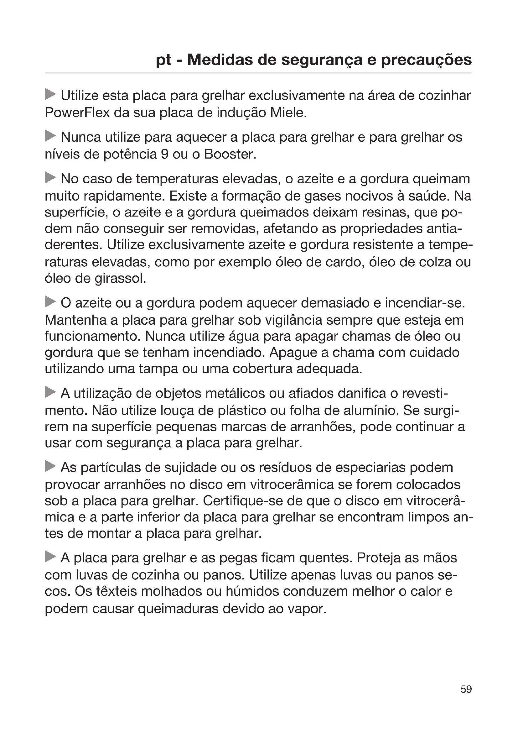 Utilize esta placa para grelhar exclusivamente na área de cozinhar PowerFlex da sua placa de indução Miele. Nunca utilize para aquecer a placa para grelhar e para grelhar os níveis de potência 9 ou o Booster. No caso de temperaturas elevadas, o azeite e a gordura queimam muito rapidamente. Existe a formação de gases nocivos à saúde. Na superfície, o azeite e a gordura queimados deixam resinas, que po- dem não conseguir ser removidas, afetando as propriedades antia- derentes. Utilize exclusivamente azeite e gordura resistente a tempe- raturas elevadas, como por exemplo óleo de cardo, óleo de colza ou óleo de girassol. O azeite ou a gordura podem aquecer demasiado e incendiar-se. Mantenha a placa para grelhar sob vigilância sempre que esteja em funcionamento. Nunca utilize água para apagar chamas de óleo ou gordura que se tenham incendiado. Apague a chama com cuidado utilizando uma tampa ou uma cobertura adequada. A utilização de objetos metálicos ou afiados danifica o revesti- mento. Não utilize louça de plástico ou folha de alumínio. Se surgi- rem na superfície pequenas marcas de arranhões, pode continuar a usar com segurança a placa para grelhar. As partículas de sujidade ou os resíduos de especiarias podem provocar arranhões no disco em vitrocerâmica se forem colocados sob a placa para grelhar. Certifique-se de que o disco em vitrocerâ- mica e a parte inferior da placa para grelhar se encontram limpos an- tes de montar a placa para grelhar. A placa para grelhar e as pegas ficam quentes. Proteja as mãos com luvas de cozinha ou panos. Utilize apenas luvas ou panos se- cos. Os têxteis molhados ou húmidos conduzem melhor o calor e podem causar queimaduras devido ao vapor.pt - O seu contributo para proteção do ambiente