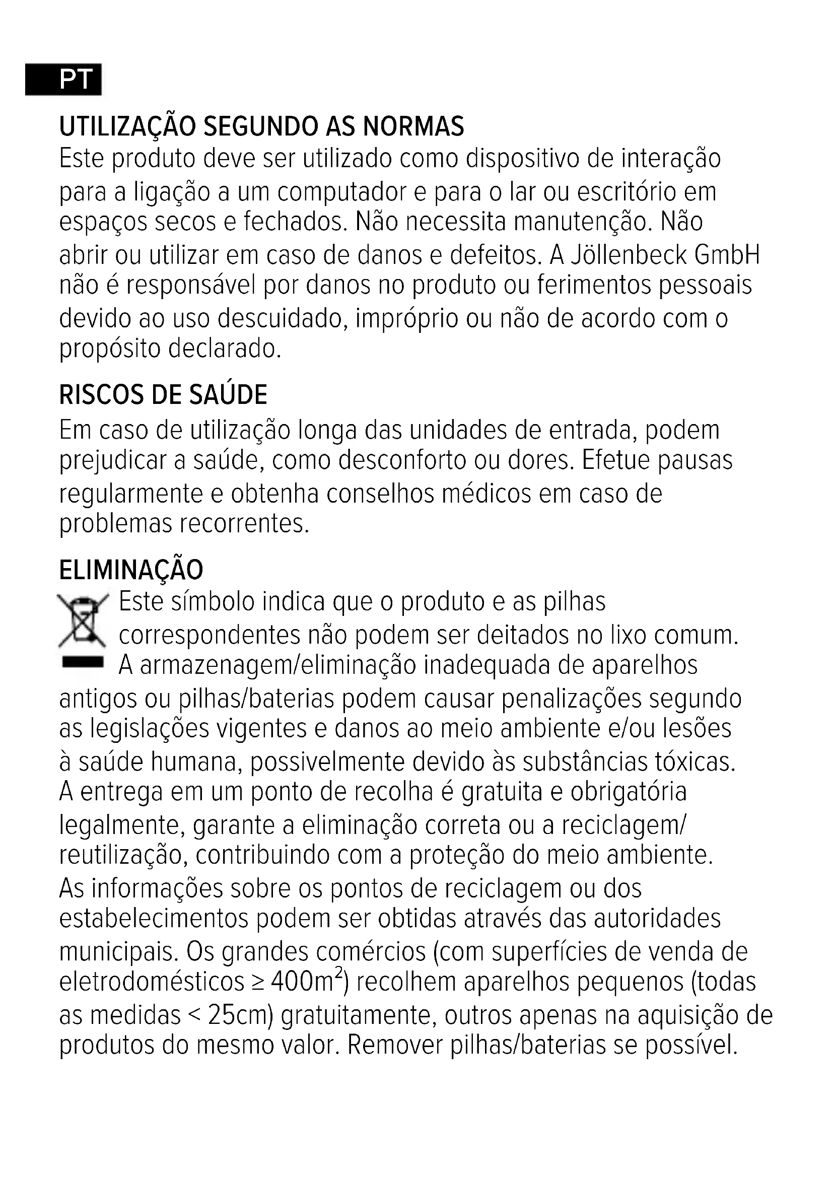 Este produto deve ser utilizado como dispositivo de interação para a ligação a um computador e para o lar ou escritório em espaços secos e fechados. Não necessita manutenção. Não abrir ou utilizar em caso de danos e defeitos. A Jöllenbeck GmbH não é responsável por danos no produto ou ferimentos pessoais devido ao uso descuidado, impróprio ou não de acordo com o propósito declarado.