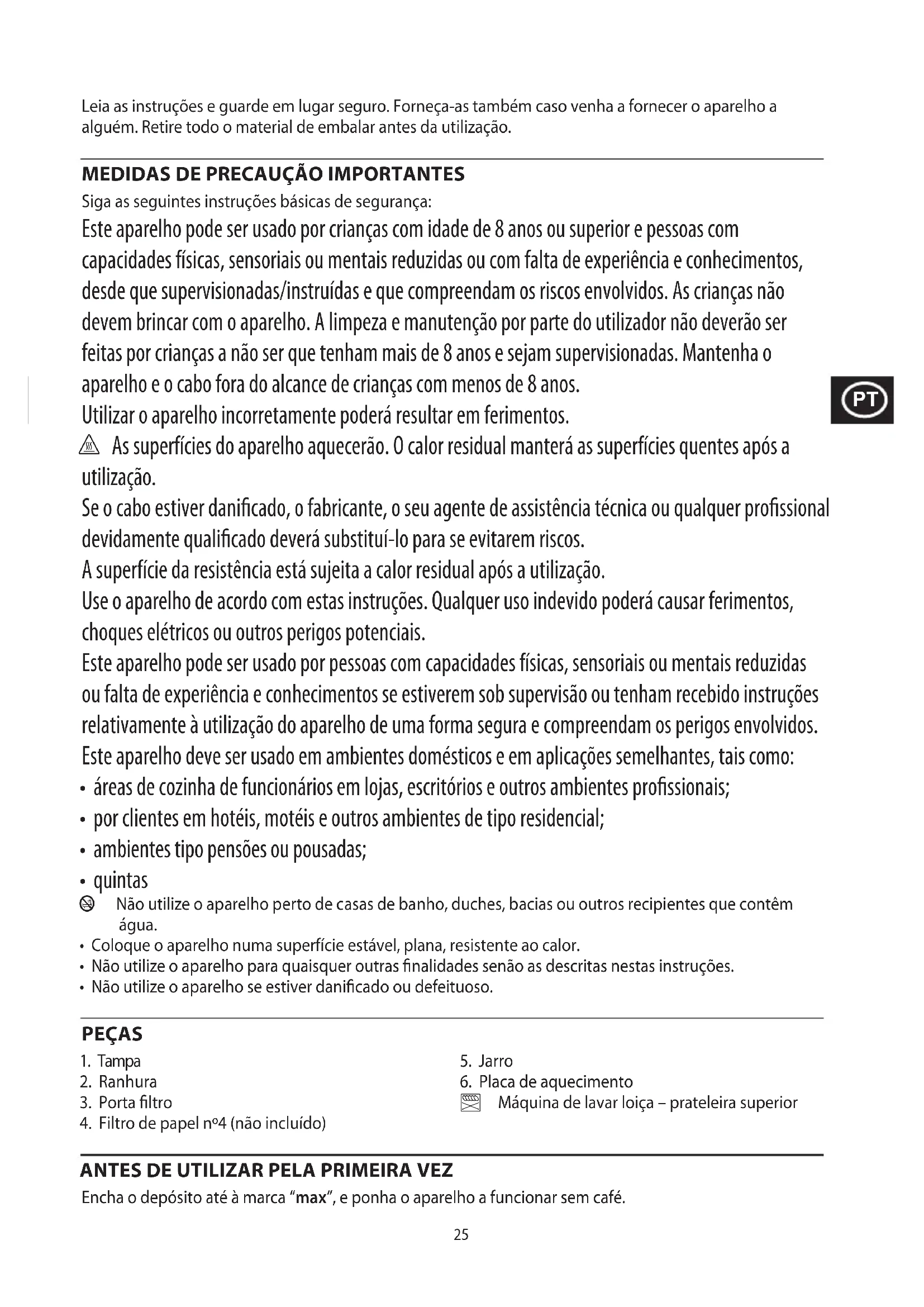 Siga as seguintes instruções básicas de segurança: Este aparelho pode ser usado por crianças com idade de 8 anos ou superior e pessoas com capacidades físicas, sensoriais ou mentais reduzidas ou com falta de experiência e conhecimentos, desde que supervisionadas/instruídas e que compreendam os riscos envolvidos. As crianças não devem brincar com o aparelho. A limpeza e manutenção por parte do utilizador não deverão ser feitas por crianças a não ser que tenham mais de 8 anos e sejam supervisionadas. Mantenha o aparelho e o cabo fora do alcance de crianças com menos de 8 anos. Utilizar o aparelho incorretamente poderá resultar em ferimentos. h As superfícies do aparelho aquecerão. O calor residual manterá as superfícies quentes após a utilização. Se o cabo estiver danicado, o fabricante, o seu agente de assistência técnica ou qualquer prossional devidamente qualicado deverá substituí-lo para se evitarem riscos. A superfície da resistência está sujeita a calor residual após a utilização. Use o aparelho de acordo com estas instruções. Qualquer uso indevido poderá causar ferimentos, choques elétricos ou outros perigos potenciais. Este aparelho pode ser usado por pessoas com capacidades físicas, sensoriais ou mentais reduzidas ou falta de experiência e conhecimentos se estiverem sob supervisão ou tenham recebido instruções relativamente à utilização do aparelho de uma forma segura e compreendam os perigos envolvidos. Este aparelho deve ser usado em ambientes domésticos e em aplicações semelhantes, tais como: