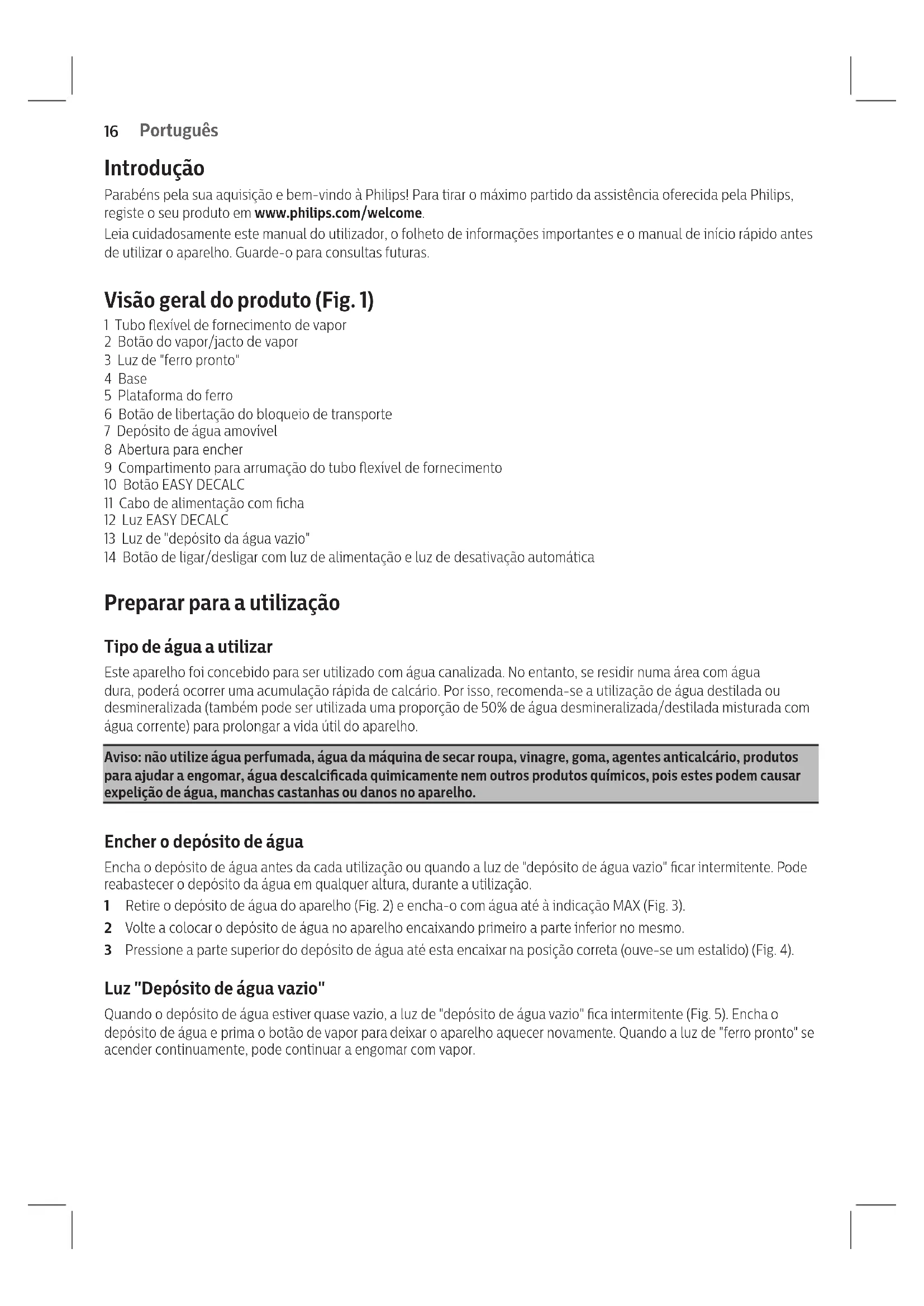 8 Arrêtez le nettoyage lorsque l'eau ne s'échappe plus de la semelle. 9 Vous pouvez recommencer à utiliser l'appareil immédiatement. Autrement, débranchez l'appareil une fois le détartrage terminé. Rangement 1 Arrêtez l'appareil et débranchez-le. Remarque : il est recommandé de vider le réservoir d'eau après chaque utilisation. 2 Posez le fer à repasser sur son support et verrouillez-le en appuyant sur le bouton de déverrouillage du fer (g. 23). 3 Laissez refroidir l'appareil. 4 Pliez le cordon d'arrivée de la vapeur et enroulez-le dans le compartiment de rangement du cordon vapeur (g. 24). 5 Pliez le cordon d'alimentation et attachez-le avec la bande Velcro. 6 Vous pouvez transporter l'appareil par la poignée du fer d'une seule main lorsque le fer est verrouillé sur son support. Dépannage Cette rubrique présente les problèmes les plus courants que vous pouvez rencontrer avec votre appareil. Si vous ne parvenez pas à résoudre le problème à l'aide des informations ci-dessous, rendez-vous sur www.philips.com/support pour consulter les questions fréquemment posées ou contactez le Service Consommateurs de votre pays. Problème Cause Solution De l'eau sale, des taches marron ou des particules de calcaire s'échappent de la semelle. Du calcaire s'est accumulé dans l'appareil car il n'a pas été détartré régulièrement. Détartrez l'appareil et la semelle (voir le chapitre « Nettoyage et entretien »). Vous avez mis des produits chimiques ou des additifs dans le réservoir d'eau. N'utilisez jamais de produits chimiques ni d'additifs avec l'appareil. Si vous l'avez fait, suivez la procédure du chapitre « Nettoyage et entretien » pour éliminer les produits chimiques. Il n'y a pas de vapeur ou peu de vapeur. L'appareil n'a pas susamment chaué. Patientez jusqu'à ce que le voyant « Fer prêt » reste allumé. Il faut environ 2 minutes. Il n'y a pas assez d'eau dans le réservoir d'eau. Remplissez le réservoir d'eau jusqu'au niveau MAX. Français15 Français Problème Cause Solution Du calcaire s'est accumulé dans l'appareil car il n'a pas été détartré régulièrement. Détartrez l'appareil et la semelle (voir le chapitre « Nettoyage et entretien »). De l'eau s'écoule de la semelle. La vapeur se condense en eau dans le cordon lorsque vous utilisez la vapeur pour la première fois ou lorsque vous ne l'avez pas utilisée pendant longtemps. Ce phénomène est normal. Tenez le fer à l'écart du vêtement et appuyez sur la gâchette vapeur. Patientez jusqu'à ce que de la vapeur, et non plus de l'eau, s'échappe de la semelle. La housse de la planche à repasser devient humide ou des gouttes d'eau apparaissent sur le sol/le vêtement. Votre housse de planche à repasser n'est pas conçue pour résister à un débit élevé de vapeur. Utilisez une couche de feutre dans la housse de la planche à repasser pour empêcher la formation de gouttes d'eau. La surface sous le socle de l'appareil devient humide, ou de l'eau et/ou de la vapeur s'échappe de sous le bouton EASY DECALC. Le bouton EASY DECALC n'a pas été correctement vissé. Éteignez l'appareil et attendez 2 heures qu'il refroidisse. Dévissez et revissez correctement le bouton. La bague d'étanchéité en caoutchouc du bouton EASY DECALC est usée. Contactez un Centre Service Agréé Philips pour vous procurer un nouveau bouton EASY DECALC. Le fer ne chaue pas et le voyant DECALC clignote en rouge. L'appareil vous rappelle d'exécuter la procédure de détartrage. Le voyant clignote après environ un mois d'utilisation. Eectuez la procédure de détartrage, suivez les instructions de la section « Détartrage de l'appareil ». Garantie et assistance Si vous avez besoin d'une assistance ou d'informations supplémentaires, consultez le site Web www.philips.com/support ou lisez le dépliant sur la garantie internationale.16 Português Introdução Parabéns pela sua aquisição e bem-vindo à Philips! Para tirar o máximo partido da assistência oferecida pela Philips, registe o seu produto em www.philips.com/welcome. Leia cuidadosamente este manual do utilizador, o folheto de informações importantes e o manual de início rápido antes de utilizar o aparelho. Guarde-o para consultas futuras. Visão geral do produto (Fig. 1) 1 Tubo exível de fornecimento de vapor 2 Botão do vapor/jacto de vapor 3 Luz de "ferro pronto" 4 Base 5 Plataforma do ferro 6 Botão de libertação do bloqueio de transporte 7 Depósito de água amovível 8 Abertura para encher 9 Compartimento para arrumação do tubo exível de fornecimento 10 Botão EASY DECALC 11 Cabo de alimentação com cha 12 Luz EASY DECALC 13 Luz de "depósito da água vazio" 14 Botão de ligar/desligar com luz de alimentação e luz de desativação automática Preparar para a utilização Tipo de água a utilizar Este aparelho foi concebido para ser utilizado com água canalizada. No entanto, se residir numa área com água dura, poderá ocorrer uma acumulação rápida de calcário. Por isso, recomenda-se a utilização de água destilada ou desmineralizada (também pode ser utilizada uma proporção de 50% de água desmineralizada/destilada misturada com água corrente) para prolongar a vida útil do aparelho. Aviso: não utilize água perfumada, água da máquina de secar roupa, vinagre, goma, agentes anticalcário, produtos para ajudar a engomar, água descalcicada quimicamente nem outros produtos químicos, pois estes podem causar expelição de água, manchas castanhas ou danos no aparelho. Encher o depósito de água Encha o depósito de água antes da cada utilização ou quando a luz de "depósito de água vazio" car intermitente. Pode reabastecer o depósito da água em qualquer altura, durante a utilização. 1 Retire o depósito de água do aparelho (Fig. 2) e encha-o com água até à indicação MAX (Fig. 3). 2 Volte a colocar o depósito de água no aparelho encaixando primeiro a parte inferior no mesmo. 3 Pressione a parte superior do d