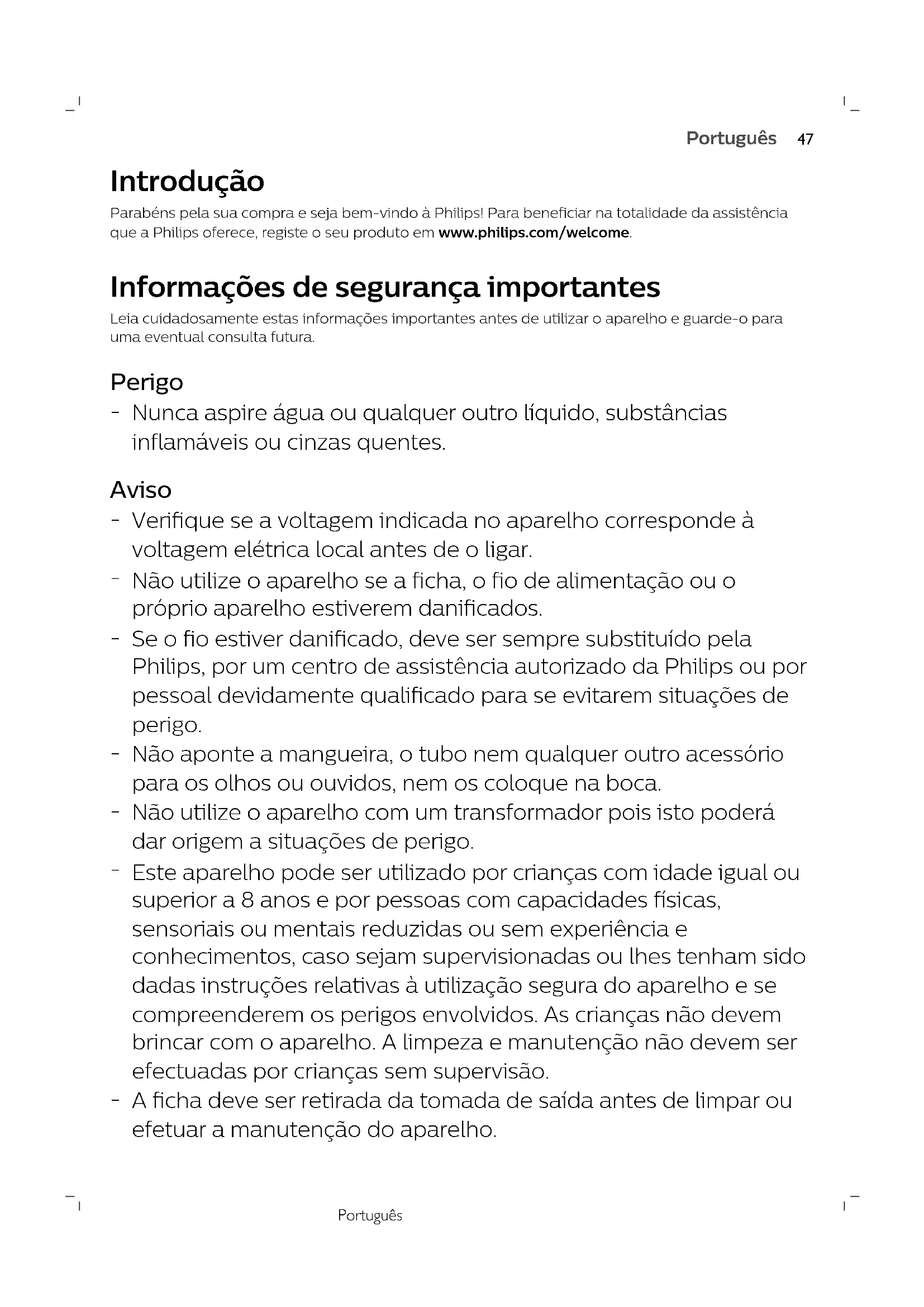 Português- Este aspirador foi concebido apenas para utilização doméstica. Não o utilize para aspirar resíduos de obras, pó de cimento, cinzas, areia fina, cal e substâncias semelhantes. Nunca utilize o aspirador sem um ou mais dos filtros. Isto pode danificar o motor e reduzir a vida útil do aspirador. Limpe sempre todas as peças do aspirador conforme indicado no manual do utilizador. Não limpe nenhuma peça com água e/ou agentes de limpeza se isto não for indicado especificamente no manual do utilizador. Cuidado