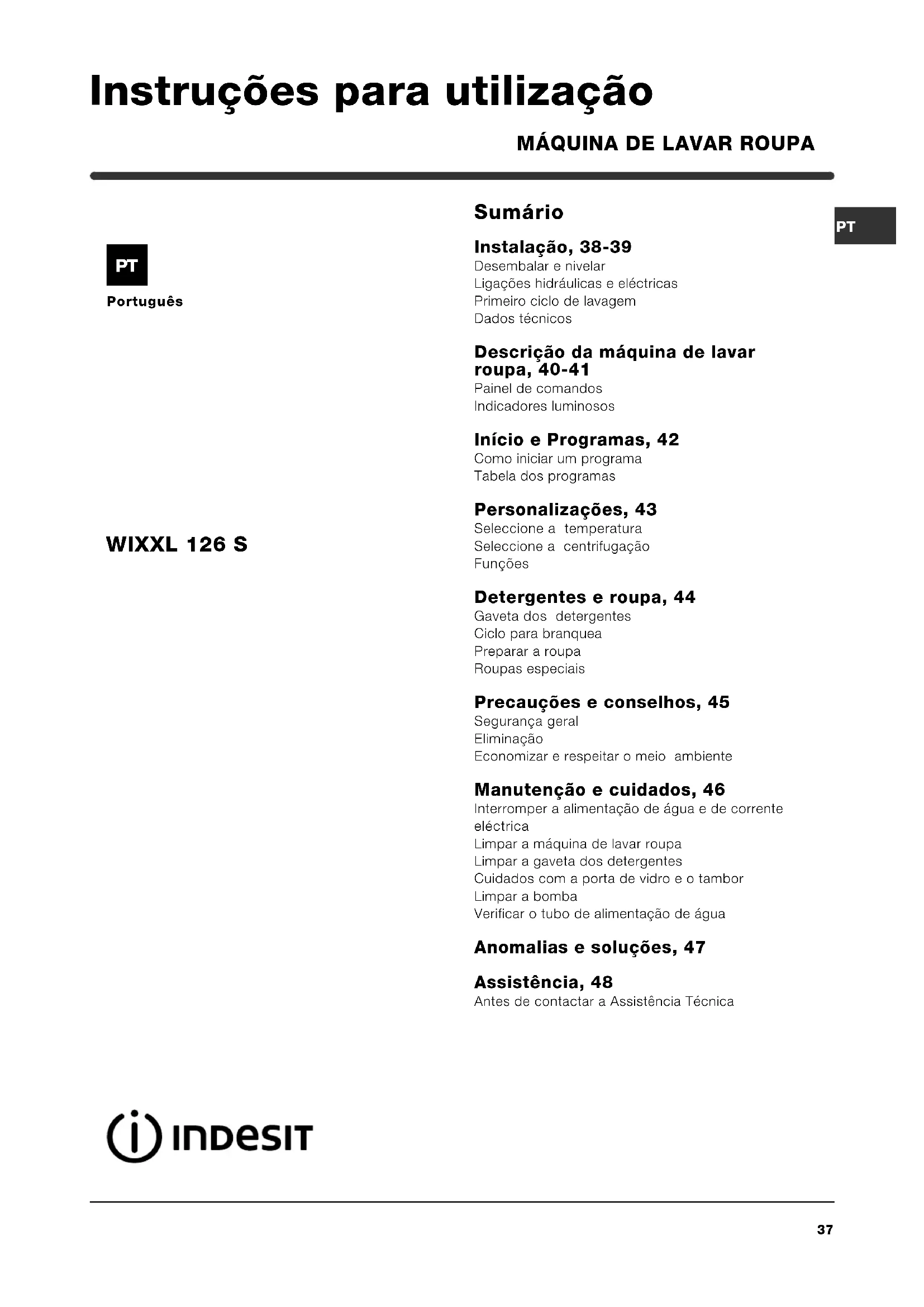 Português Sumário Instalação, 38-39 Desembalar e nivelar Ligações hidráulicas e eléctricas Primeiro ciclo de lavagem Dados técnicos Descrição da máquina de lavar roupa, 40-41 Painel de comandos Indicadores luminosos Início e Programas, 42 Como iniciar um programa Tabela dos programas Personalizações, 43 Seleccione a temperatura Seleccione a centrifugação Funções Detergentes e roupa, 44 Gaveta dos detergentes Ciclo para branquea Preparar a roupa Roupas especiais Precauções e conselhos, 45 Segurança geral Eliminação Economizar e respeitar o meio ambiente Manutenção e cuidados, 46 Interromper a alimentação de água e de corrente eléctrica Limpar a máquina de lavar roupa Limpar a gaveta dos detergentes Cuidados com a porta de vidro e o tambor Limpar a bomba Verificar o tubo de alimentação de água Anomalias e soluções, 47 Assistência, 48 Antes de contactar a Assistência Técnica