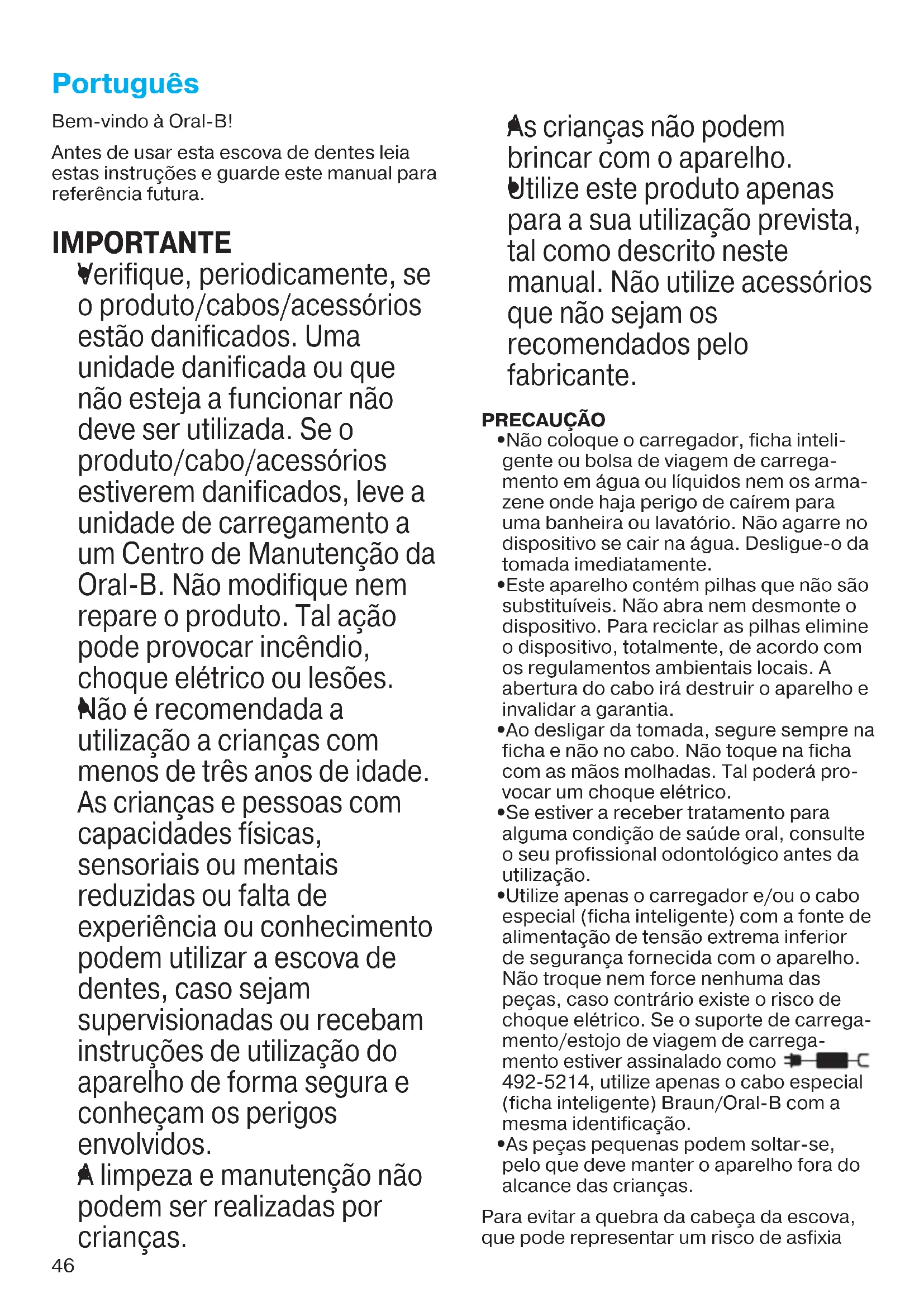 Não é recomendada a utilização a crianças com menos de três anos de idade. As crianças e pessoas com capacidades físicas, sensoriais ou mentais reduzidas ou falta de experiência ou conhecimento podem utilizar a escova de dentes, caso sejam supervisionadas ou recebam instruções de utilização do aparelho de forma segura e conheçam os perigos envolvidos.