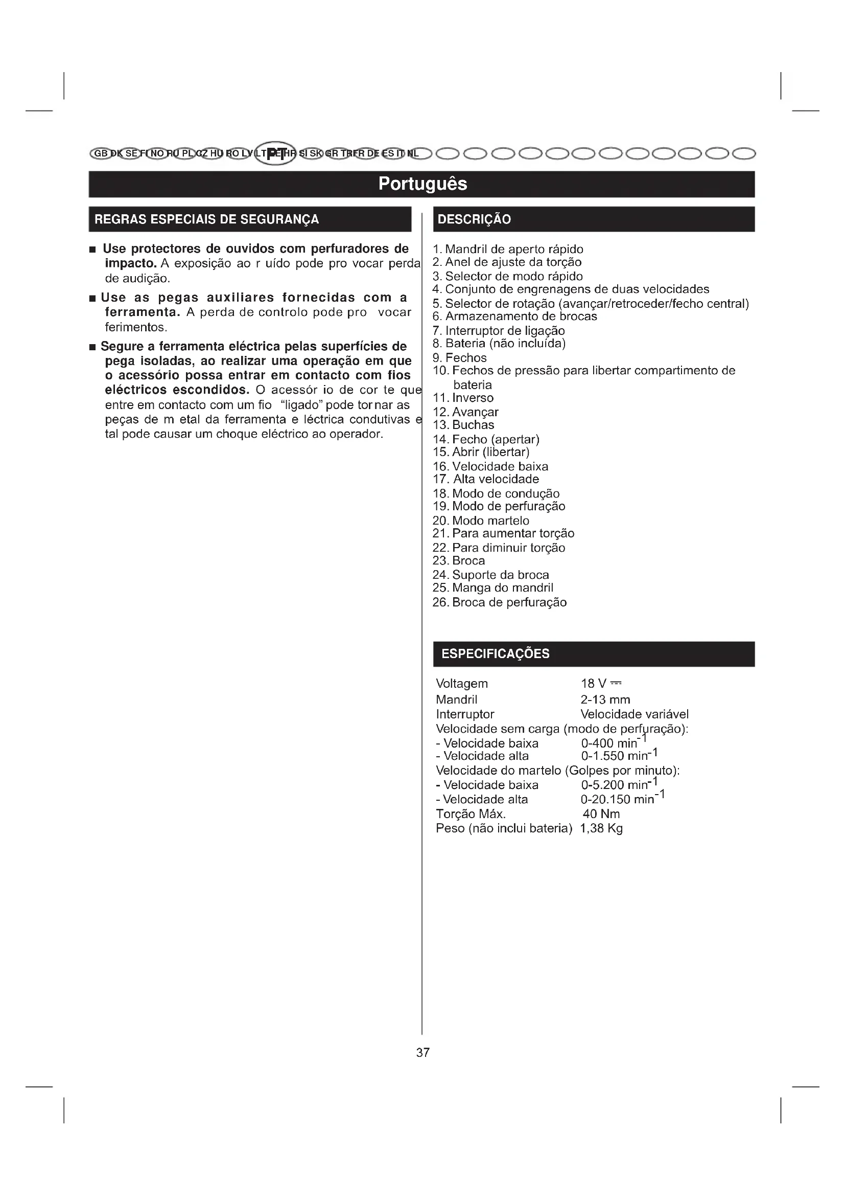 ESPECIFICAÇÕES Voltagem 18 V Mandril 2-13 mm Interruptor Velocidade variável Velocidade sem carga (modo de perfuração): - Velocidade baixa 0-400 min