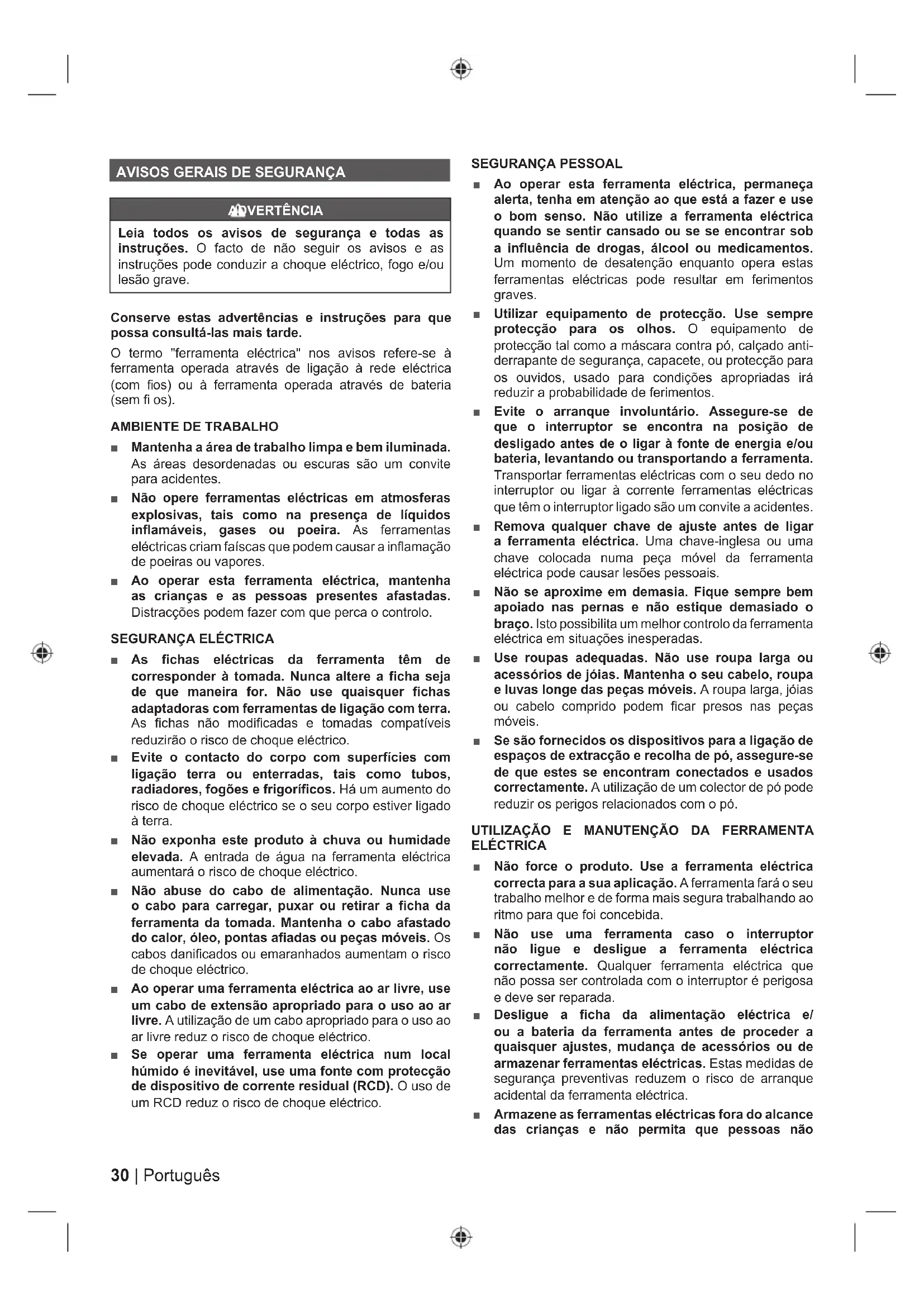 ADVERTÊNCIA Leia todos os avisos de segurança e todas as instruções. O facto de não seguir os avisos e as instruções pode conduzir a choque eléctrico, fogo e/ou lesão grave. Conserve estas advertências e instruções para que possa consultá-las mais tarde. O termo "ferramenta eléctrica" nos avisos refere-se à ferramenta operada através de ligação à rede eléctrica (com fi os) ou à ferramenta operada através de bateria (sem fi os).