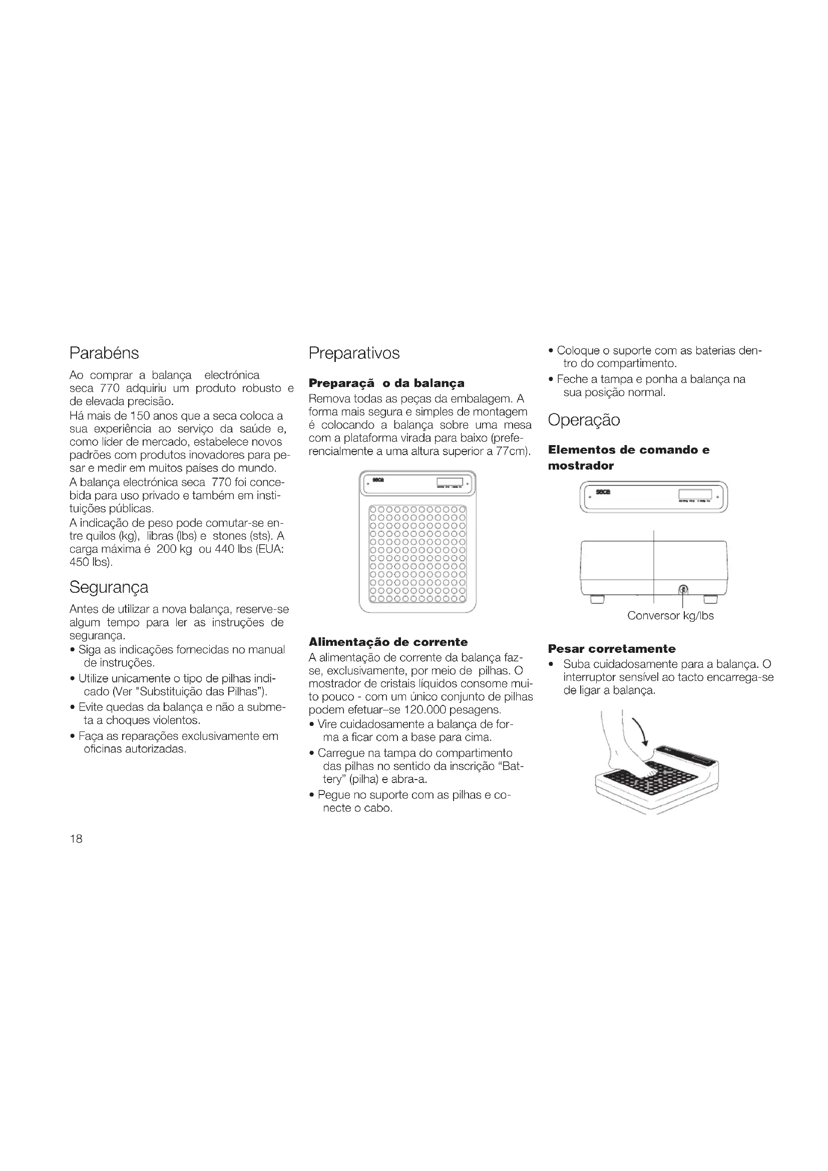 Suba cuidadosamente para a balança. O interruptor sensível ao tacto encarrega-se de ligar a balança. Conversor kg/lbs Ao comprar a balança electrónica seca 770 adquiriu um produto robusto e de elevada precisão. Há mais de 150 anos que a seca coloca a sua experiência ao serviço da saúde e, como líder de mercado, estabelece novos padrões com produtos inovadores para pe- sar e medir em muitos países do mundo. A balança electrónica seca 770 foi conce- bida para uso privado e também em insti- tuições públicas. A indicação de peso pode comutar-se en- tre quilos (kg), libras (lbs) e stones (sts). A carga máxima é 200 kg ou 440 lbs (EUA: 450 lbs).19