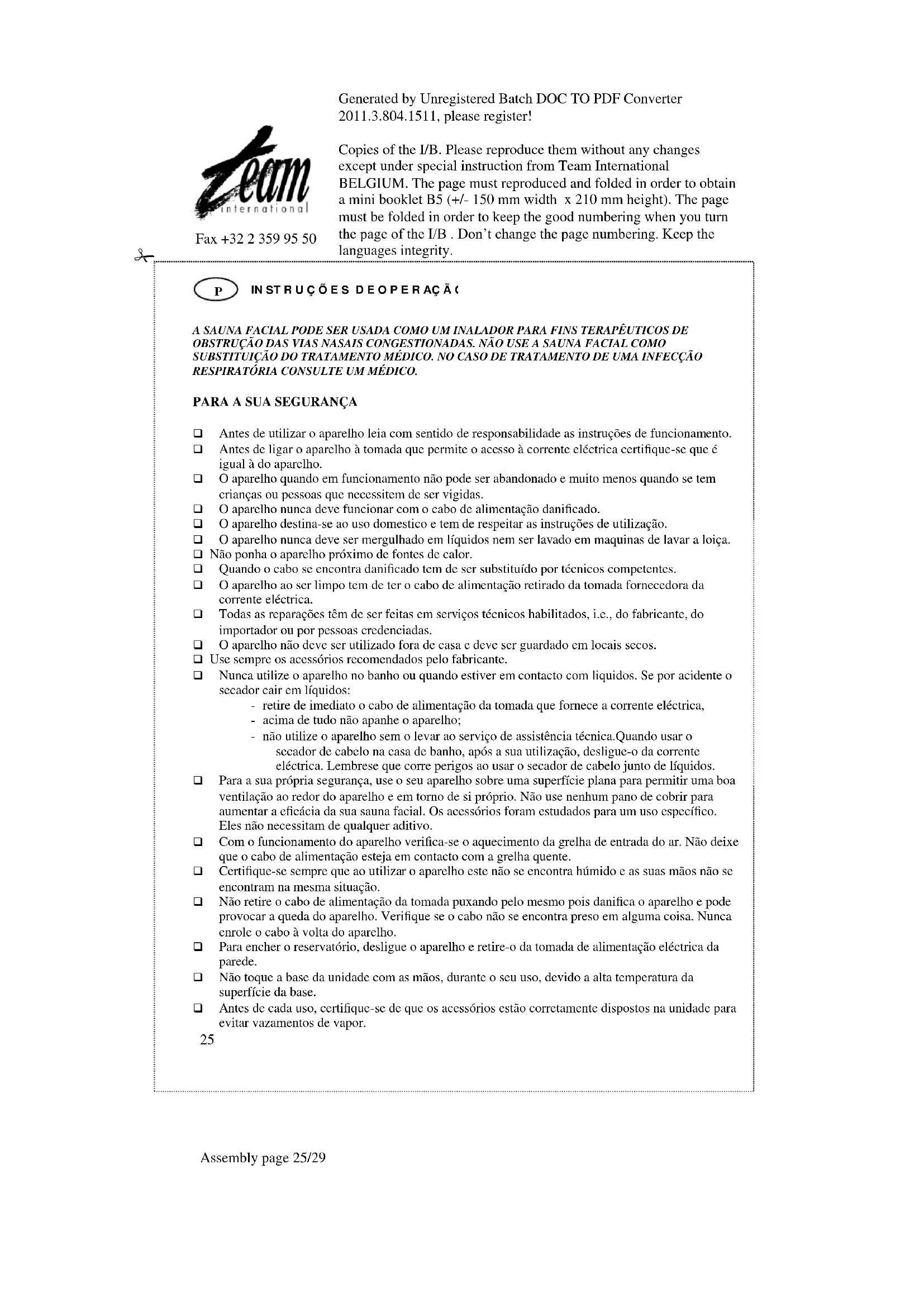 o tamanho dos orifícios da máscara facial e o consumo. Quanto maiores forem os orifícios, maior será a quantidade de vapor na máscara (6). Feche os seus olhos e relaxe. Deixe que a sauna facial revitalize a beleza natural da sua pele e a sua luminosidade enquato ela penetra profundamente nos seus poros para retirar todas as impurezas. Recomendamos que seja feita uma respiração normal através do nariz durante o uso do inalador. Não é necessário respirar fortemente.Generated by Unregistered Batch DOC TO PDF Converter 2011.3.804.1511, please register! Copies of the I/B. Please reproduce them without any changes except under special instruction from Team International BELGIUM. The page must reproduced and folded in order to obtain a mini booklet B5 (+/- 150 mm width x 210 mm height). The page must be folded in order to keep the good numbering when you turn the page of the I/B . Don’t change the page numbering. Keep the languages integrity.