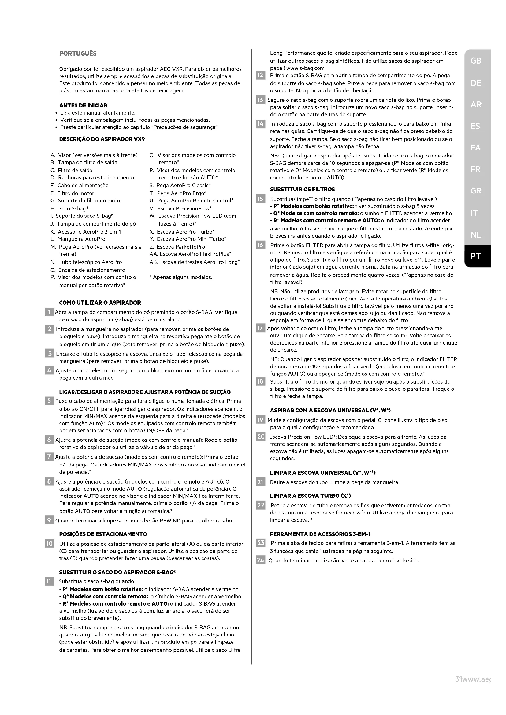 PT31www.aeg.com PORTUGUÊS Obrigado por ter escolhido um aspirador AEG VX9. Para obter os melhores resultados, utilize sempre acessórios e peças de substituição originais. Este produto foi concebido a pensar no meio ambiente. Todas as peças de plástico estão marcadas para efeitos de reciclagem.
