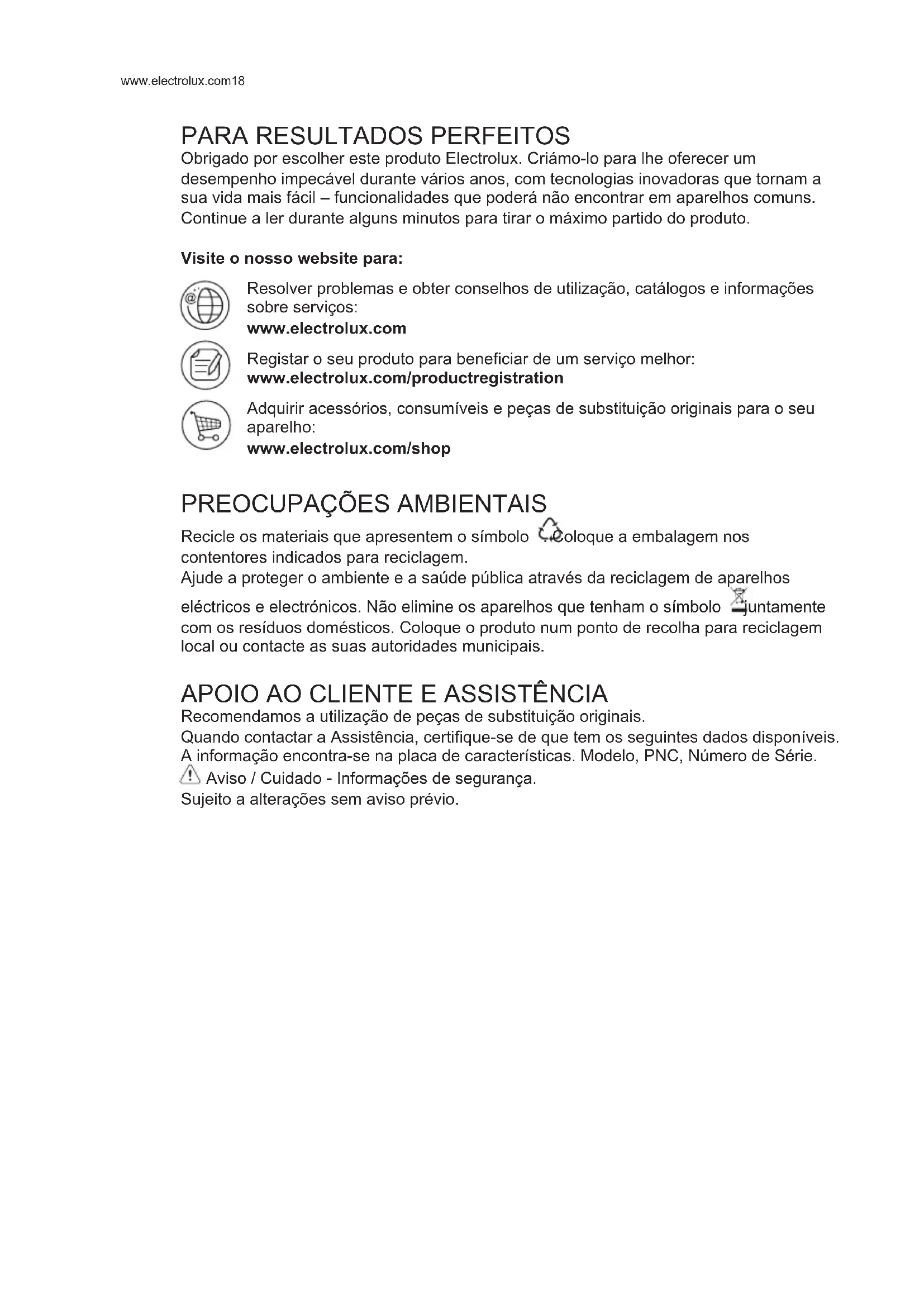 Obrigado por escolher este produto Electrolux Criámo-lo para lhe oferecer um desempenho impecável durante vários anos, com tecnologias inovadoras que tornam a sua vida mais fácil – funcionalidades que poderá não encontrar em aparelhos comuns Continue a ler durante alguns minutos para tirar o máximo partido do produto Visite o nosso website para: Resolver problemas e obter conselhos de utilização, catálogos e informações sobre serviços: www.electrolux.com Registar o seu produto para beneciar de um serviço melhor: www.electrolux.com/productregistration Adquirir acessórios, consumíveis e peças de substituição originais para o seu aparelho: www.electrolux.com/shop