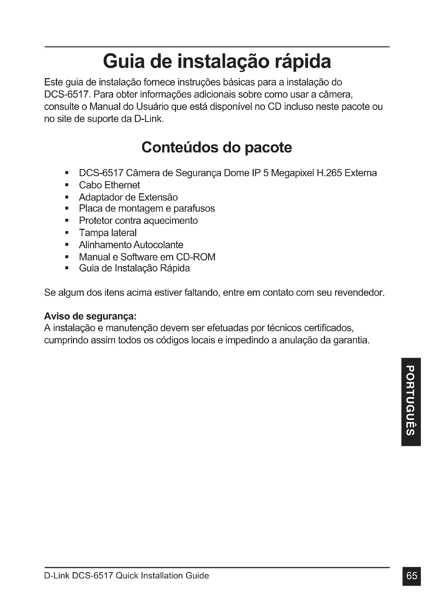 PORTUGUÊS Guia de instalação rápida Este guia de instalação fornece instruções básicas para a instalação do DCS-6517. Para obter informações adicionais sobre como usar a câmera, consulte o Manual do Usuário que está disponível no CD incluso neste pacote ou no site de suporte da D-Link. Conteúdos do pacote DCS-6517 Câmera de Segurança Dome IP 5 Megapixel H.265 Externa Cabo Ethernet Adaptador de Extensão Placa de montagem e parafusos Protetor contra aquecimento Tampa lateral Alinhamento Autocolante Manual e Software em CD-ROM Guia de Instalação Rápida Se algum dos itens acima estiver faltando, entre em contato com seu revendedor. Aviso de segurança: A instalação e manutenção devem ser efetuadas por técnicos certificados, cumprindo assim todos os códigos locais e impedindo a anulação da garantia.D-Link DCS-6517 Quick Installation Guide