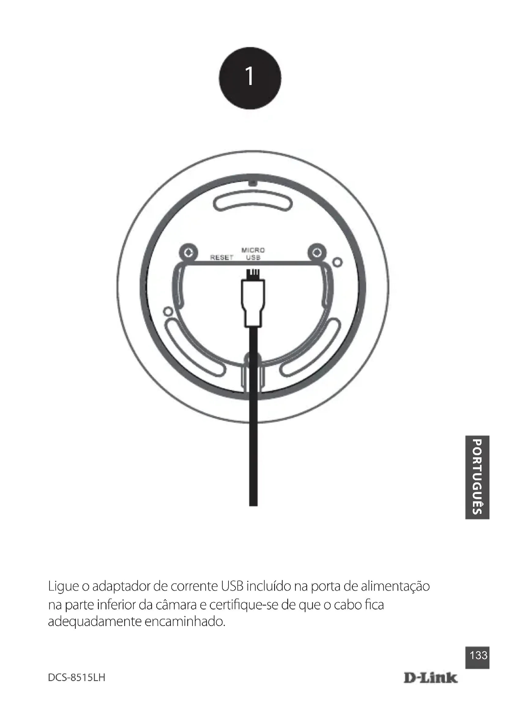 Ligue o adaptador de corrente USB incluído na porta de alimentação na parte inferior da câmara e certifique-se de que o cabo fica adequadamente encaminhado.DCS-8515LH