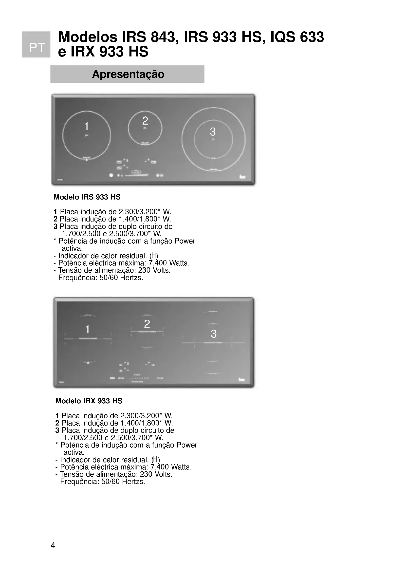 - Potência de indução com a função Power activa. - Indicador de calor residual. (H) - Potência eléctrica máxima: 7.400 Watts. - Tensão de alimentação: 230 Volts. - Frequência: 50/60 Hertzs.Modelo IRS 933 HS 1 Placa indução de 2.300/3.200* W. 2 Placa indução de 1.400/1.800* W. 3 Placa indução de duplo circuito de 1.700/2.500 e 2.500/3.700* W.