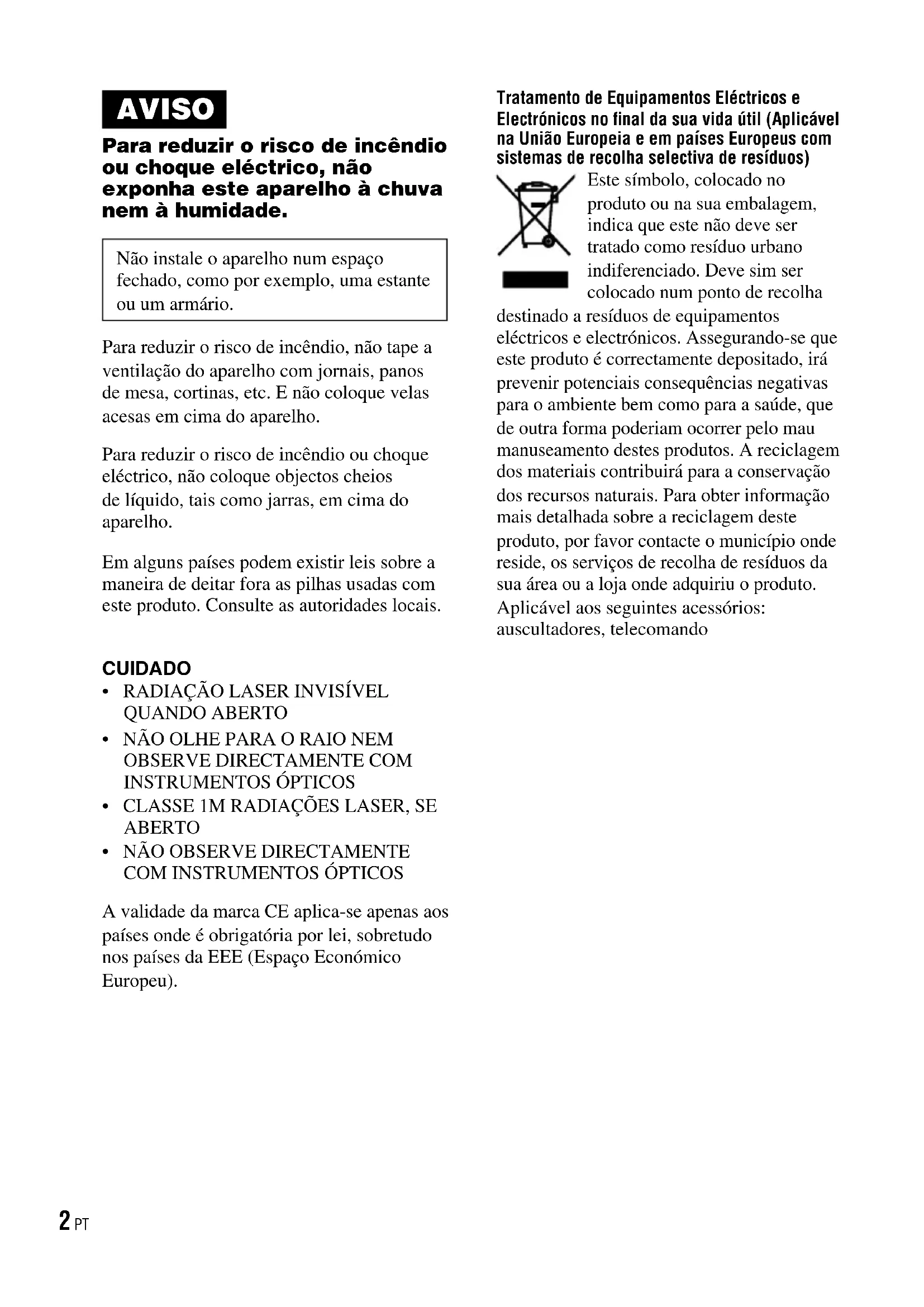 Télécommande 8 TEXT 26 TIMER 27 TRACK 27 Informations complémentaires D-NE730.FR.2-653-427-21(1) 37 FRAVISO Para reduzir o risco de incêndio ou choque eléctrico, não exponha este aparelho à chuva nem à humidade. Não instale o aparelho num espaço fechado, como por exemplo, uma estante ou um armário. Para reduzir o risco de incêndio, não tape a ventilação do aparelho com jornais, panos de mesa, cortinas, etc. E não coloque velas acesas em cima do aparelho. Para reduzir o risco de incêndio ou choque eléctrico, não coloque objectos cheios de líquido, tais como jarras, em cima do aparelho. Em alguns países podem existir leis sobre a maneira de deitar fora as pilhas usadas com este produto. Consulte as autoridades locais. CUIDADO