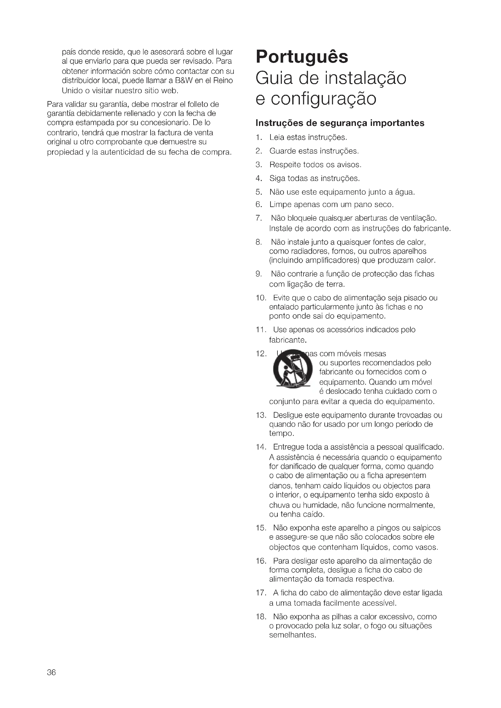 Garantia limitada Este produto foi concebido e fabricado de acordo com os mais elevados padrões de qualidade. No entanto, se houver qualquer problema com o mesmo, a B&W e os seus distribuidores internacionais garantem o serviço de mão-de-obra (podendo-se aplicar exclusões) e de substituição de peças gratuitos em qualquer país servido por um distribuidor oficial de B&W. Esta garantia limitada é válida por um período de cinco anos a partir da data de compra ou dois anos pela parte electrónica incluindo altifalantes amplificados. Termos e condições 1 Esta garantia limita-se à reparação do equipamento. Nem transporte, nem quaisquer outros custos, nem qualquer risco de remoção, transporte e instalação de produtos estão cobertos por esta garantia. 2 A garantia só é válida para o proprietário original. Não é transferível. 3 Esta garantia não será aplicável nos casos em que os defeitos não sejam atribuíveis a materiais e/ ou mão-de-obra na altura da compra e não será aplicável a: a. danos causados pela instalação, ligação ou embalamento incorrectos, b. danos causados por qualquer utilização que não seja a correcta conforme descrita no manual do 7702 ISW-4 manual.indd 42 6/4/09 10:36:5843 utilizador, negligência, modificações ou utilização de peças que não sejam fabricadas ou autorizadas pela B&W, c. danos causados por equipamento auxiliar inadequado ou defeituoso, d. danos causados por acidentes, relâmpagos, água, incêndio, calor, guerra, distúrbios públicos ou qualquer outra causa para além do controlo razoável da B&W e dos seus distribuidores nomeados, e. produtos cujo número de série tenha sido alterado, apagado, removido ou que tenha sido tornado ilegível, f. reparações ou modificações que tenham sido efectuadas por pessoa não autorizada. 4 Esta garantia complementa quaisquer obrigações legais nacionais e regionais de revendedores ou distribuidores nacionais e não afecta os seus direitos estatuários como cliente. Como reivindicar reparações sob garantia Caso seja necessário assistência técnica, queira seguir o procedimento seguinte: 1 Se o equipamento está a ser utilizado no país de compra, deverá contactar o distribuidor autorizado da B&W de onde o equipamento foi comprado. 2 Se o equipamento está a ser utilizado fora do país de compra, deverá contactar o distribuidor nacional da B&W do país de residência que o aconselhará onde o equipamento pode ser reparado. Pode telefonar para a B&W no Reino Unido ou visitar a nossa página na internet para obter os pormenores de contacto do seu distribuidor local. Para validar a sua garantia, precisará de preencher a mesma devendo esta ser carimbada pelo seu distribuidor na data da compra. Em alternativa, precisará da factura original de venda ou outra prova de propriedade e data de compra. Italiano Manuale di istruzioni Informazioni importanti sulla sicurezza
