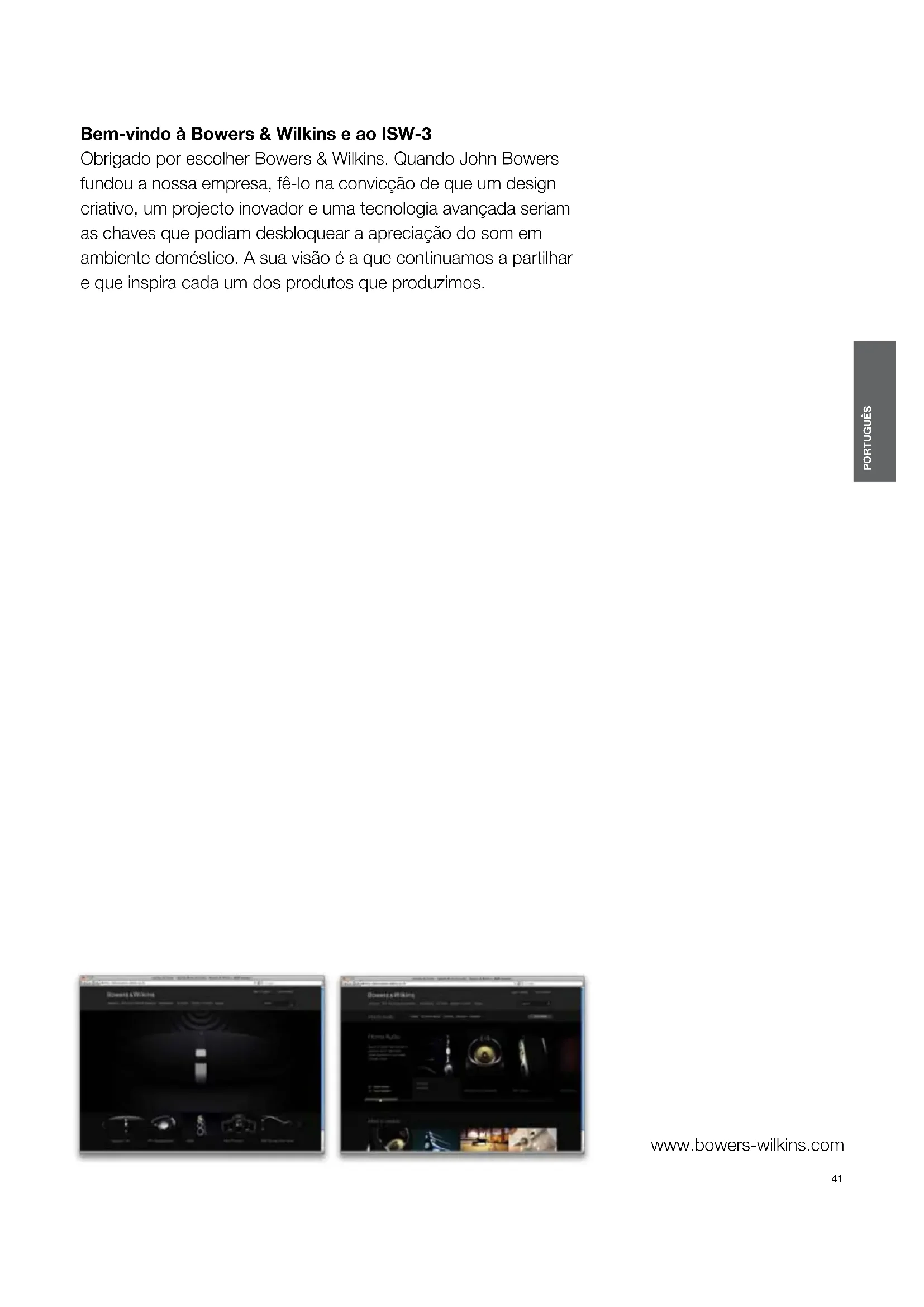 8 Pege Der Subwoofer muss nicht gewartet werden, jedoch sollte von Zeit zu Zeit die Blende für den Lüftungsschlitz entfernt und gereinigt werden. Ist der Subwoofer unter dem Fußboden eingebaut, so sollte von Zeit zu Zeit die Blende für den Lüftungsschlitz abgenommen und die Öffnung gesaugt werden, um hereingefallenen Schmutz zu entfernen.41 PORTUGUÊS www.bowers-wilkins.com Bem-vindo à Bowers & Wilkins e ao ISW-3 Obrigado por escolher Bowers & Wilkins. Quando John Bowers fundou a nossa empresa, fê-lo na convicção de que um design criativo, um projecto inovador e uma tecnologia avançada seriam as chaves que podiam desbloquear a apreciação do som em ambiente doméstico. A sua visão é a que continuamos a partilhar e que inspira cada um dos produtos que produzimos. PORTUGUÊS Contents PORTUGUÊS 41 1 Conteúdo 42 2 Aplicações 42 3 Instalação no tecto 43 4 Instalação em parede 45 5 Instalação por baixo do chão 48 6 Instalação numa unidade de cozinha