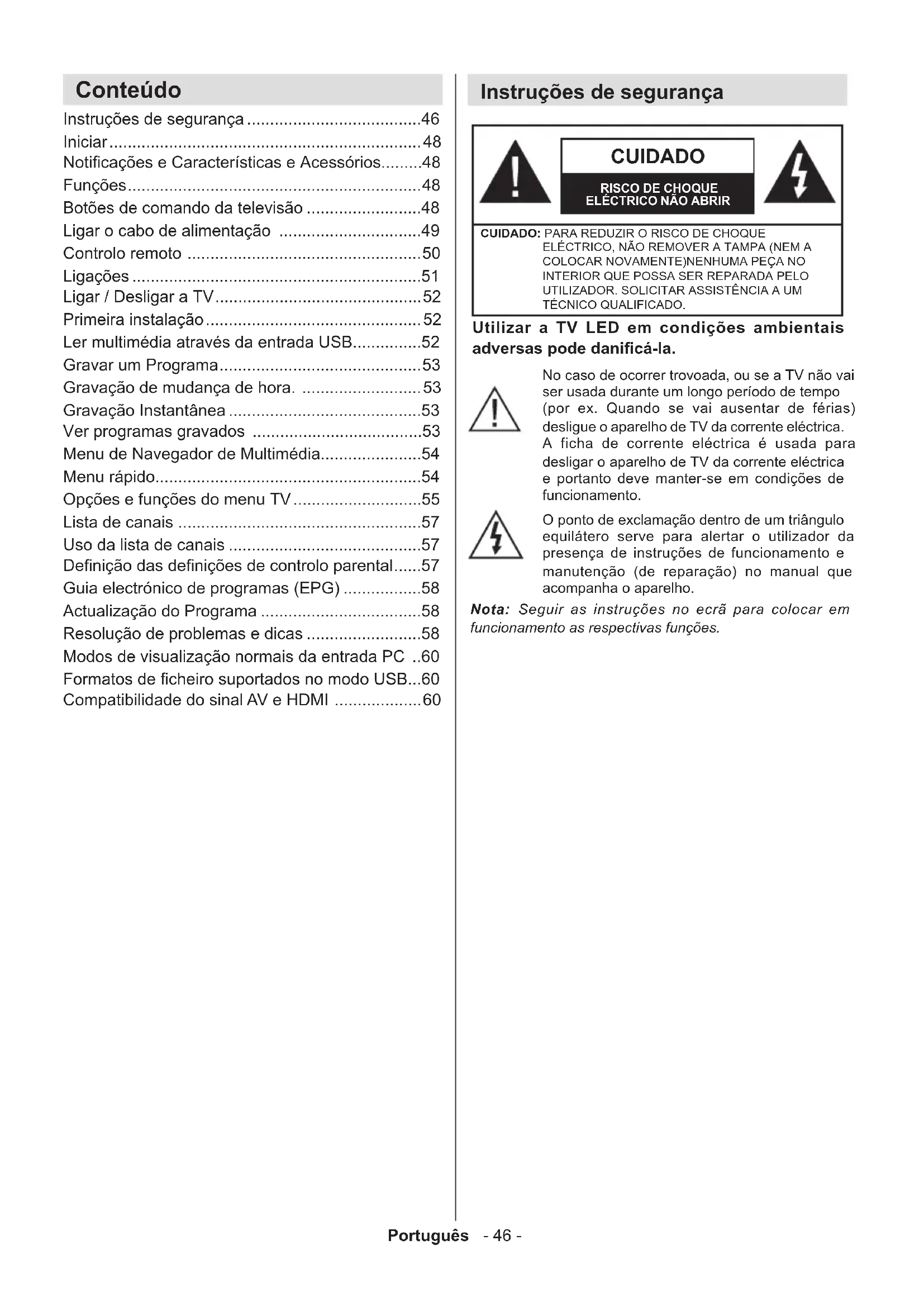 - Compatibilidade do sinal AV e HDMI Instruções de segurança Utilizar a TV LED em condições ambientais adversas pode danicá-la. CUIDADO RISCO DE CHOQUE ELÉCTRICO NÃO ABRIRCUIDADO: PARA REDUZIR O RISCO DE CHOQUE ELÉCTRICO, NÃO REMOVER A TAMPA (NEM A COLOCAR NOVAMENTE)NENHUMA PEÇA NO INTERIOR QUE POSSA SER REPARADA PELO UTILIZADOR. SOLICITAR ASSISTÊNCIA A UM TÉCNICO QUALIFICADO.Nota: Seguir as instruções no ecrã para colocar em funcionamento as respectivas funções.No caso de ocorrer trovoada, ou se a TV não vai ser usada durante um longo período de tempo (por ex. Quando se vai ausentar de férias) desligue o aparelho de TV da corrente eléctrica. A ficha de corrente eléctrica é usada para desligar o aparelho de TV da corrente eléctrica e portanto deve manter-se em condições de funcionamento.O ponto de exclamação dentro de um triângulo equilátero serve para alertar o utilizador da presença de instruções de funcionamento e manutenção (de reparação) no manual que acompanha o aparelho.Português - 47 - p. 60