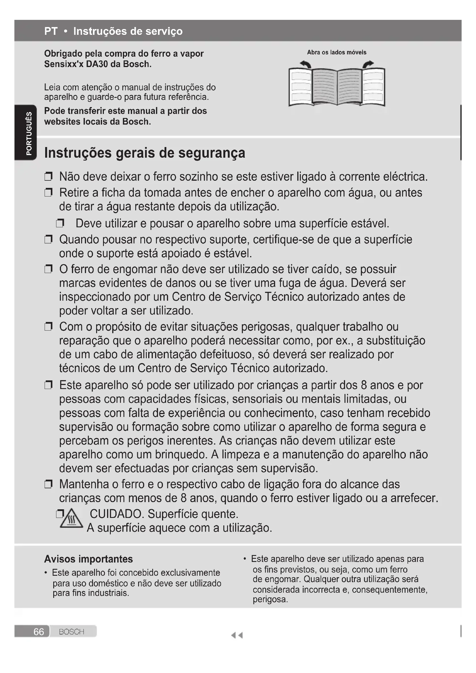 CUIDADO. Superfície quente. A superfície aquece com a utilização. Obrigado pela compra do ferro a vapor Sensixx'x DA30 da Bosch. Leia com atenção o manual de instruções do aparelho e guarde-o para futura referência. Pode transferir este manual a partir dos websites locais da Bosch. Abra os lados móveis Avisos importantes