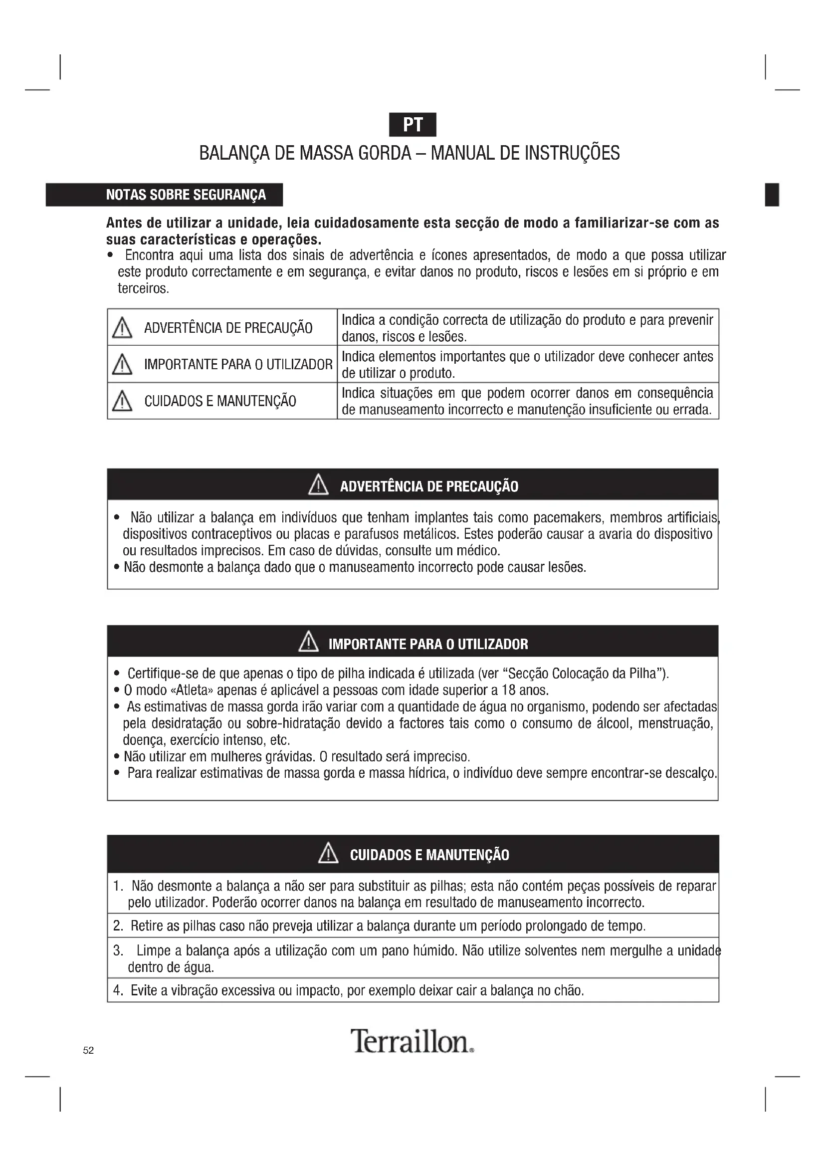 - Não utilizar a balança em indivíduos que tenham implantes tais como pacemakers, membros artificiais, dispositivos contraceptivos ou placas e parafusos metálicos. Estes poderão causar a avaria do dispositivo ou resultados imprecisos. Em caso de dúvidas, consulte um médico.