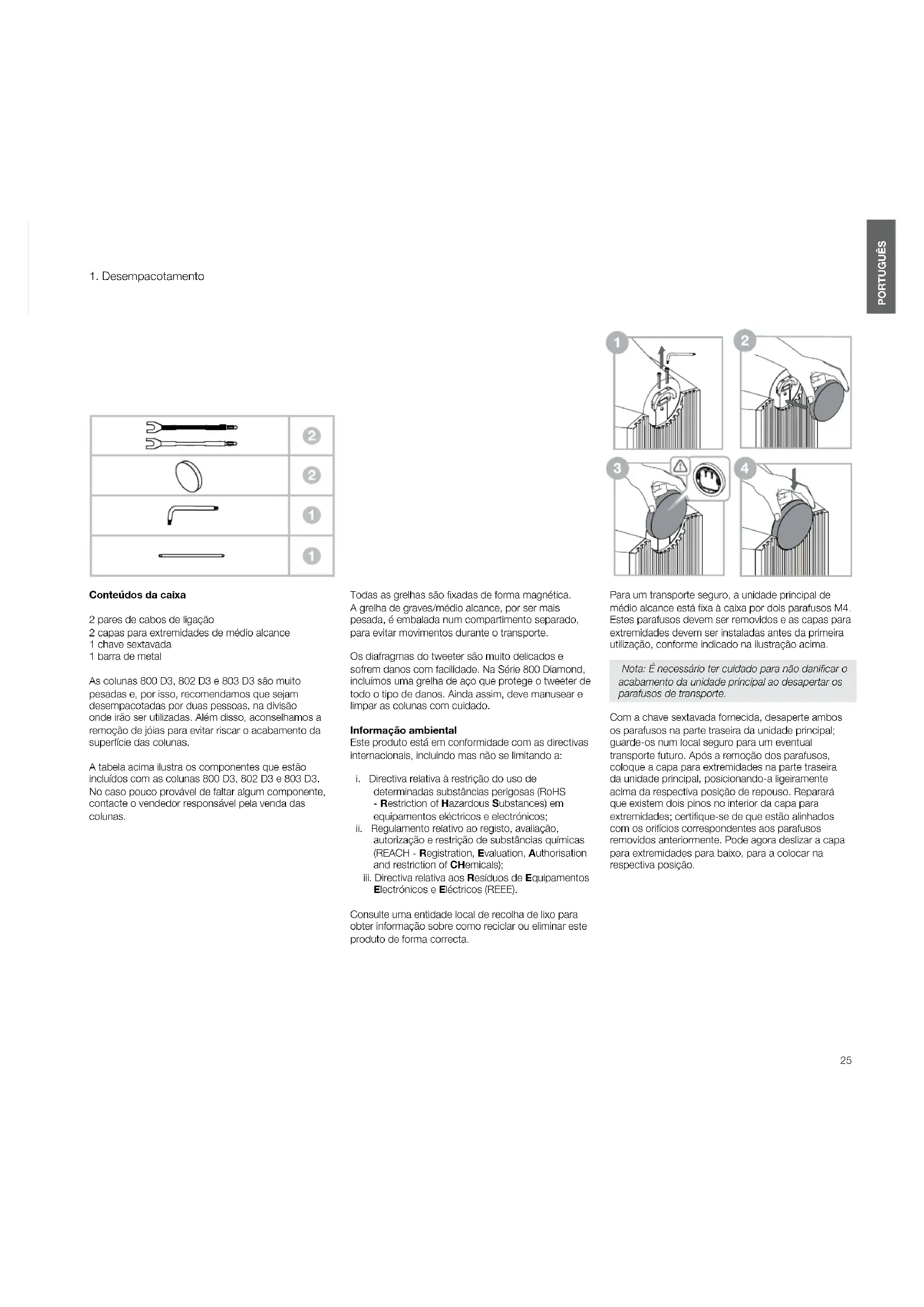 Conteúdos da caixa 2 pares de cabos de ligação 2 capas para extremidades de médio alcance 1 chave sextavada 1 barra de metal As colunas 800 D3, 802 D3 e 803 D3 são muito pesadas e, por isso, recomendamos que sejam desempacotadas por duas pessoas, na divisão onde irão ser utilizadas. Além disso, aconselhamos a remoção de jóias para evitar riscar o acabamento da superfície das colunas. A tabela acima ilustra os componentes que estão incluídos com as colunas 800 D3, 802 D3 e 803 D3. No caso pouco provável de faltar algum componente, contacte o vendedor responsável pela venda das colunas. Todas as grelhas são xadas de forma magnética. Agrelha de graves/médio alcance, por ser mais pesada, é embalada num compartimento separado, para evitar movimentos durante o transporte. Os diafragmas do tweeter são muito delicados e sofrem danos com facilidade. Na Série 800 Diamond, incluímos uma grelha de aço que protege o tweeter de todo o tipo de danos. Ainda assim, deve manusear e limpar as colunas com cuidado. Informação ambiental Este produto está em conformidade com as directivas internacionais, incluindo mas não se limitando a: