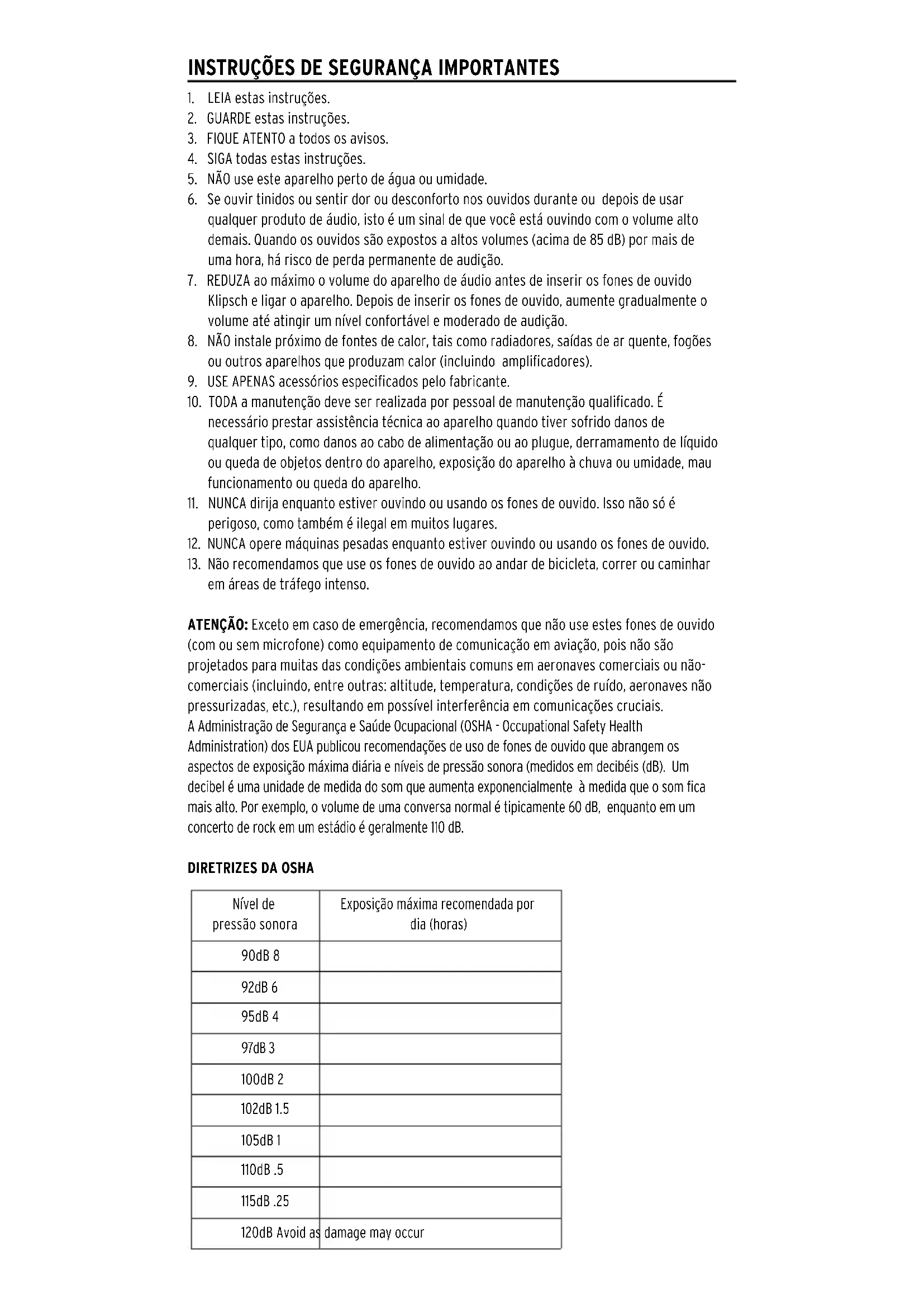 em áreas de tráfego intenso. ATENÇÃO: Exceto em caso de emergência, recomendamos que não use estes fones de ouvido (com ou sem microfone) como equipamento de comunicação em aviação, pois não são projetados para muitas das condições ambientais comuns em aeronaves comerciais ou não- comerciais (incluindo, entre outras: altitude, temperatura, condições de ruído, aeronaves não pressurizadas, etc.), resultando em possível interferência em comunicações cruciais. A Administração de Segurança e Saúde Ocupacional (OSHA - Occupational Safety Health Administration) dos EUA publicou recomendações de uso de fones de ouvido que abrangem os aspectos de exposição máxima diária e níveis de pressão sonora (medidos em decibéis (dB). Um decibel é uma unidade de medida do som que aumenta exponencialmente à medida que o som fica mais alto. Por exemplo, o volume de uma conversa normal é tipicamente 60 dB, enquanto em um concerto de rock em um estádio é geralmente 110 dB.