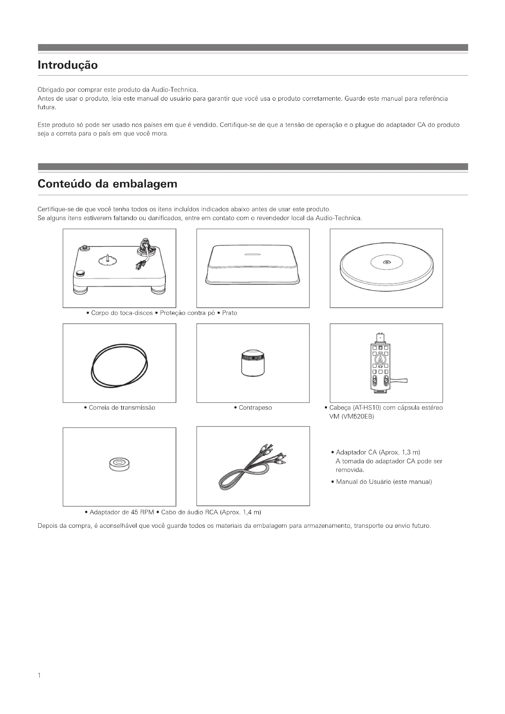 Memo1 Introdução Obrigado por comprar este produto da Audio-Technica. Antes de usar o produto, leia este manual do usuário para garantir que você usa o produto corretamente. Guarde este manual para referência futura. Este produto só pode ser usado nos países em que é vendido. Certifique-se de que a tensão de operação e o plugue do adaptador CA do produto seja a correta para o país em que você mora. Conteúdo da embalagem Certifique-se de que você tenha todos os itens incluídos indicados abaixo antes de usar este produto. Se alguns itens estiverem faltando ou danificados, entre em contato com o revendedor local da Audio-Technica.