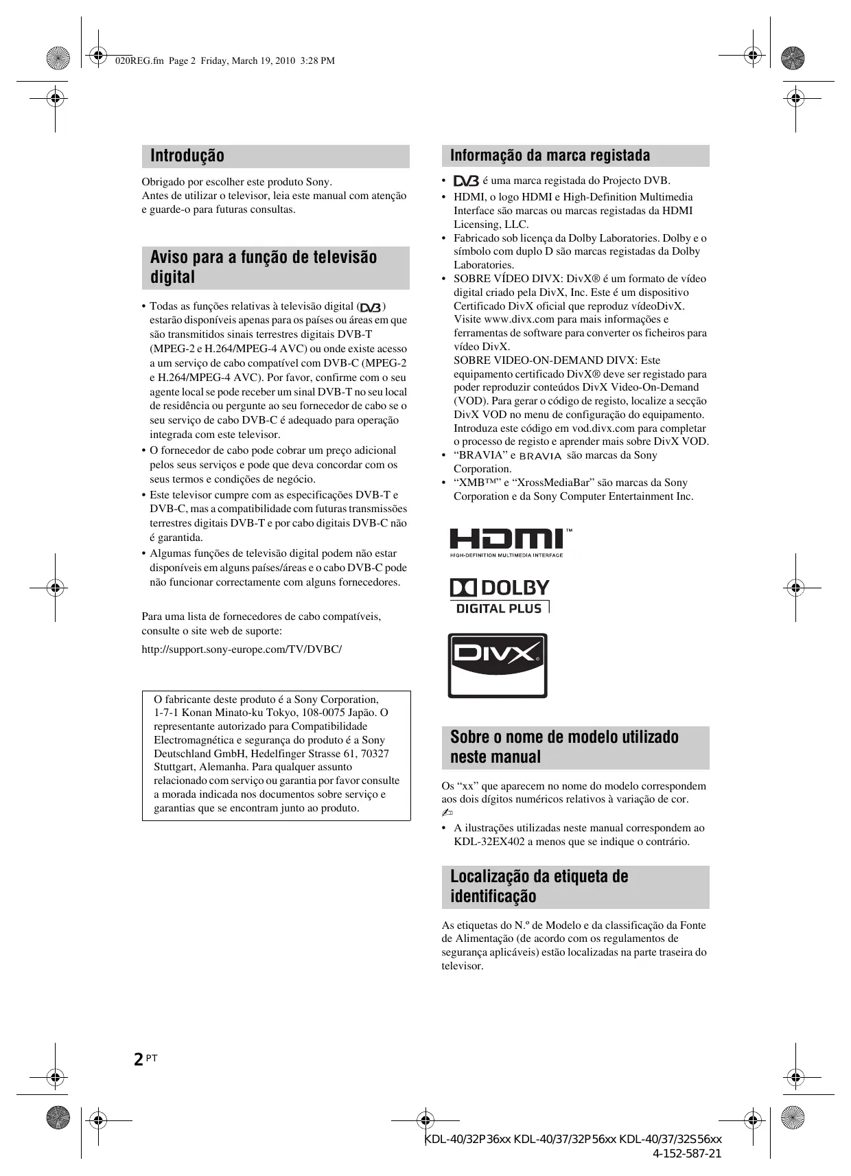 - Controleer of de antenne het einde van de levensduur heeft bereikt (drie tot vijf jaar bij normaal gebruik, een tot twee jaar bij gebruik in kustgebieden). 19 NL KDL-40/32P36xx KDL-40/37/32P56xx KDL-40/37/32S56xx 4-127-735-21(1) 020REG.fm Page 2 Friday, March 19, 2010 3:28 PM Introdução Obrigado por escolher este produto Sony. Antes de utilizar o televisor, leia este manual com atenção e guarde-o para futuras consultas. Aviso para a função de televisão digital