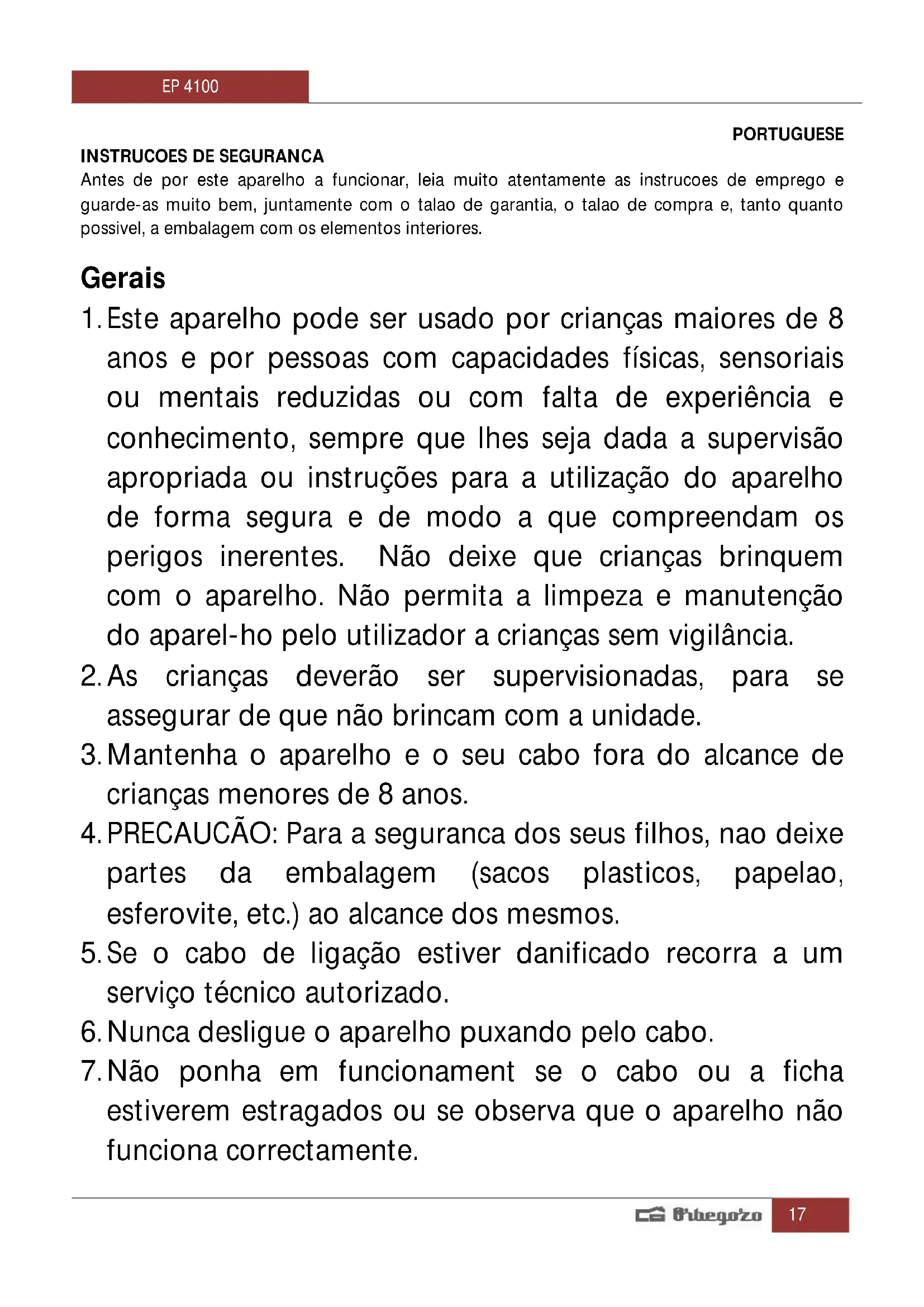 - Este aparelho pode ser utilizado por crianças a partir dos 8 anos, desde que o façam sob supervisão ou tenham recebido formação sobre a utilização segura do aparelho e compreendam os perigos que este comporta. As crianças não devem realizar operações de limpeza ou manutenção do aparelho, a menos que sejam maiores de 8 anos e se encontrem sob a supervisão de um adulto. Manter o aparelho e o seu cabo fora do alcance das crianças menores de 8 años.