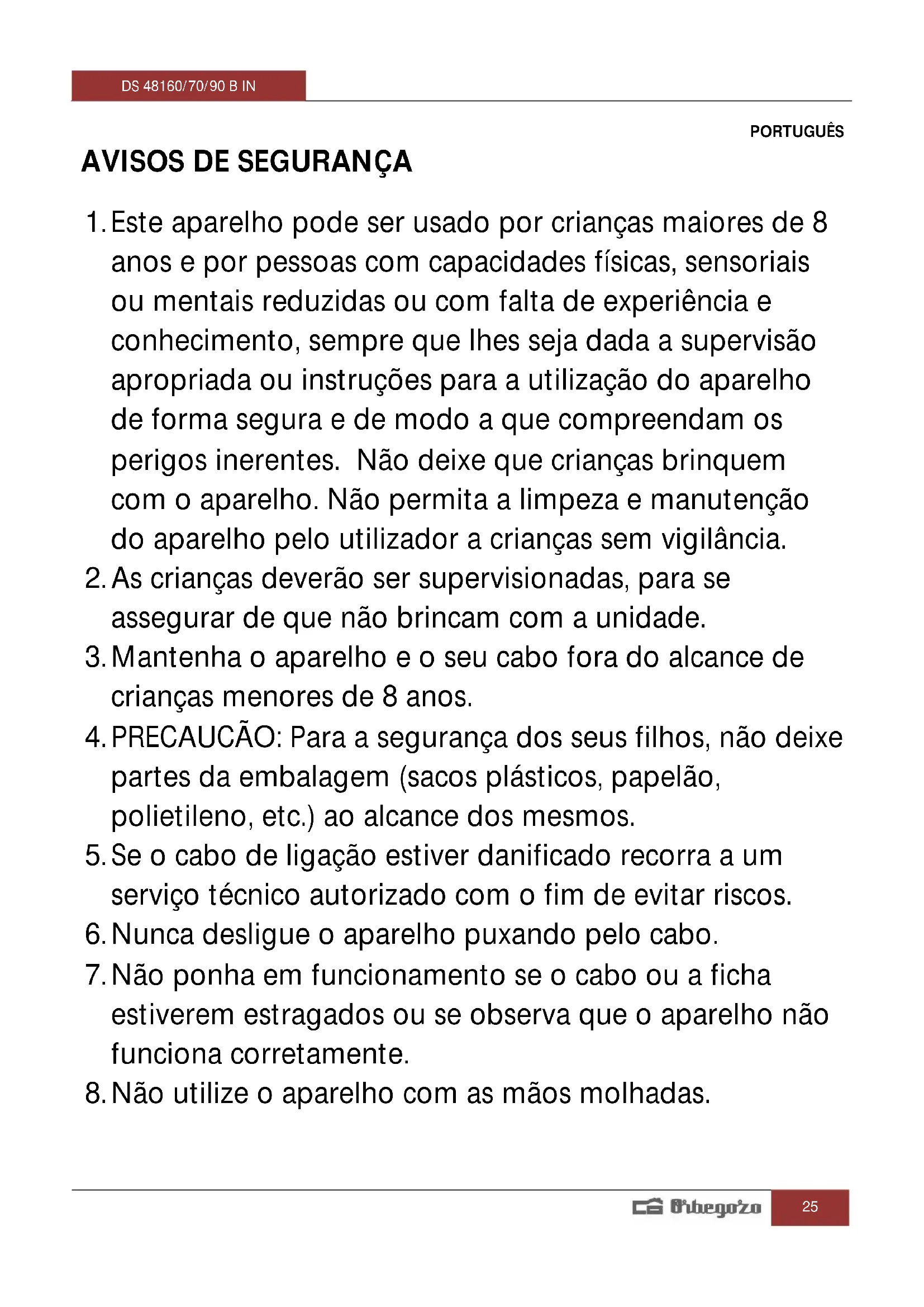 8. Não utilize o aparelho com as mãos molhadas.DS 48160/70/90 B IN