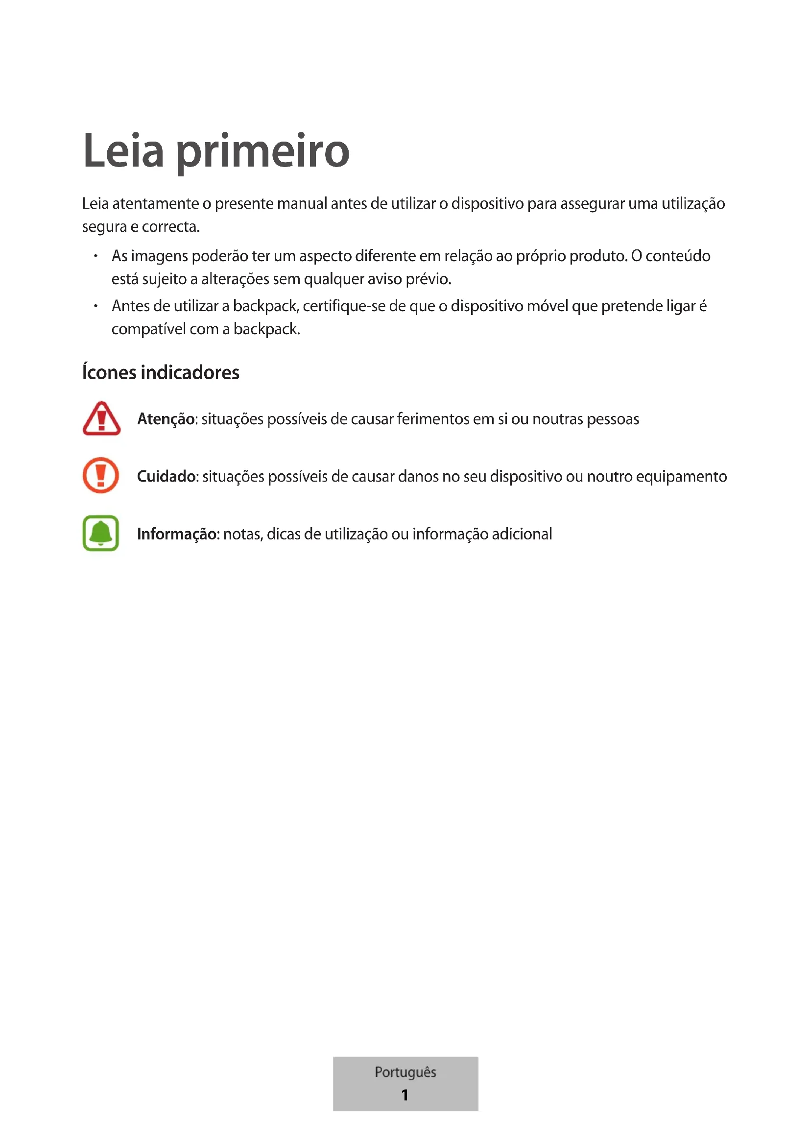 Antes de utilizar a backpack, certifique-se de que o dispositivo móvel que pretende ligar é compatível com a backpack. Ícones indicadores Atenção: situações possíveis de causar ferimentos em si ou noutras pessoas Cuidado: situações possíveis de causar danos no seu dispositivo ou noutro equipamento Informação: notas, dicas de utilização ou informação adicional Português