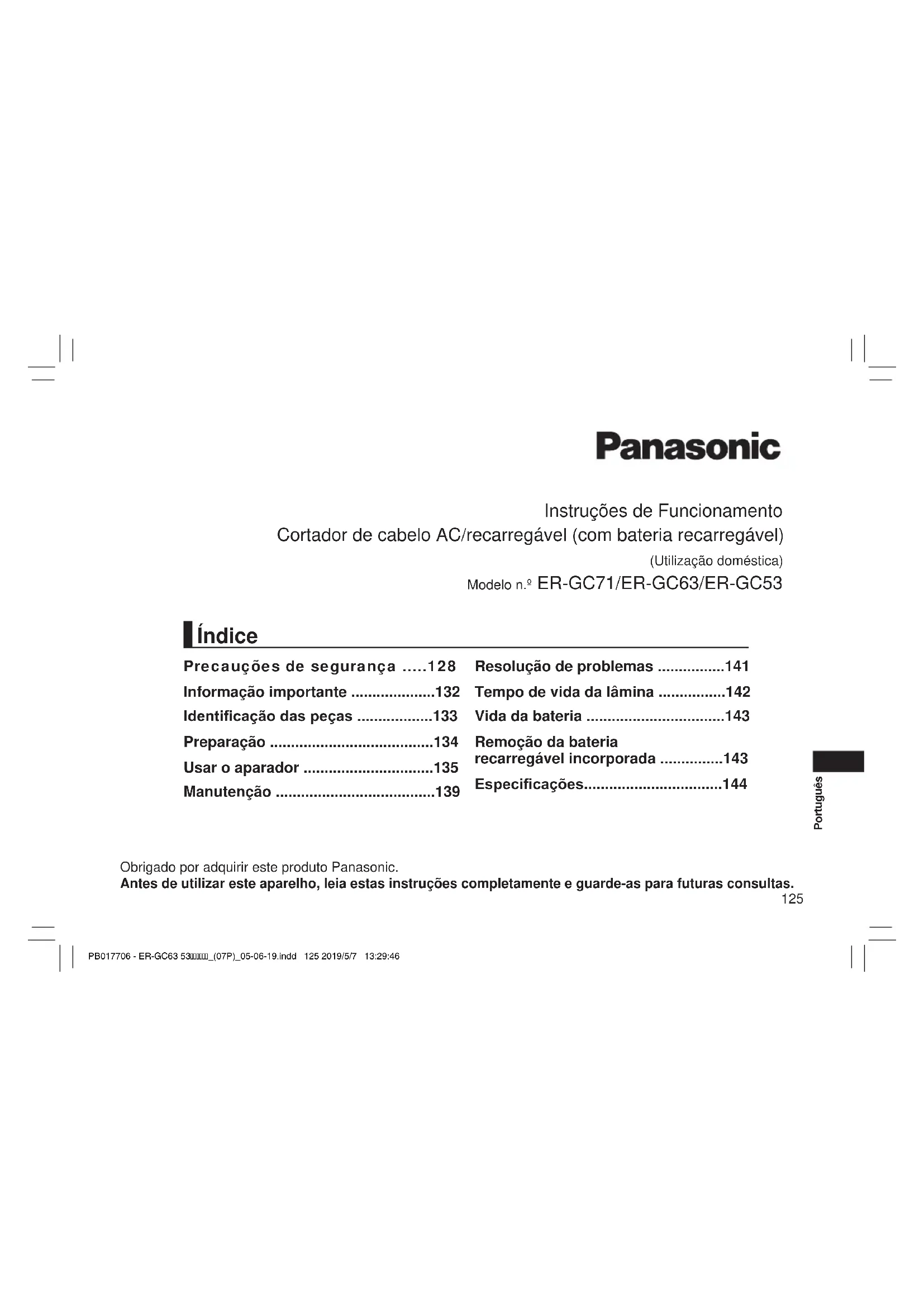 - Para proteção ambiental e reciclagem dos materiais Este aparador contém uma bateria de hidreto metálico de níquel. Certique-sedequeabateriaéeliminadanumlocal designadoocialmente,seexistirumnoseupaís. PB017706 - ER-GC63 53_(07P)_05-06-19.indd 143 2019/5/7 13:30:13144 Português Eliminação de Equipamentos Usados e Baterias Apenas para a União Europeia e países com sistemas de reciclagem Estes símbolos nos produtos, embalagens, e/ou documentos que os acompanham indicam que os produtos elétricos e eletrónicos e as baterias usados não podem ser misturados com os resíduos urbanos indiferenciados. Para um tratamento adequado, reutilização e reciclagem de produtos e baterias usados, solicitamos que os coloque em pontos de recolha próprios, em conformidade com a respetiva legislação nacional. Ao eliminar estes produtos corretamente estará a ajudar a poupar recursos valiosos e a prevenir quaisquer potenciais efeitos negativos sobre o ambiente e a saúde humana. Para mais informações acerca da recolha e reciclagem, por favor contacte a sua autarquia local. De acordo com a legislação nacional podem ser aplicadas contraordenações pela eliminação incorreta destes resíduos. Nota para o símbolo da bateria (símbolo na parte inferior) Este símbolo pode ser utilizado conjuntamente com um símbolo químico. Neste caso estará em conformidade com o estabelecido na Diretiva referente aos produtos químicos em causa. Especicações Fonte de alimentação Vejaaplacaidenticativano transformador de CA. (Conversão automática de voltagem) Voltagem do motor 1,2 V Tempo de carregamento Aprox. 8 horas Ruído acústico aéreo 60 (dB (A) re 1 pW) Este produto foi concebido apenas para utilização doméstica. PB017706 - ER-GC63 53_(07P)_05-06-19.indd 144 2019/5/7 13:30:14145 Svenska Bruksanvisning (Hushållsbruk) Trimsax för nät/laddningsbart batteri Modellnr. ER-GC71/ER-GC63/ER-GC53 Tack för att du köpt denna produkt från Panasonic. Läs igenom denna bruksanvisningen noga innan du börjar använda apparaten. Spara bruksanvisningen för framtida bruk. Säkerhetsföreskrifter p. 148