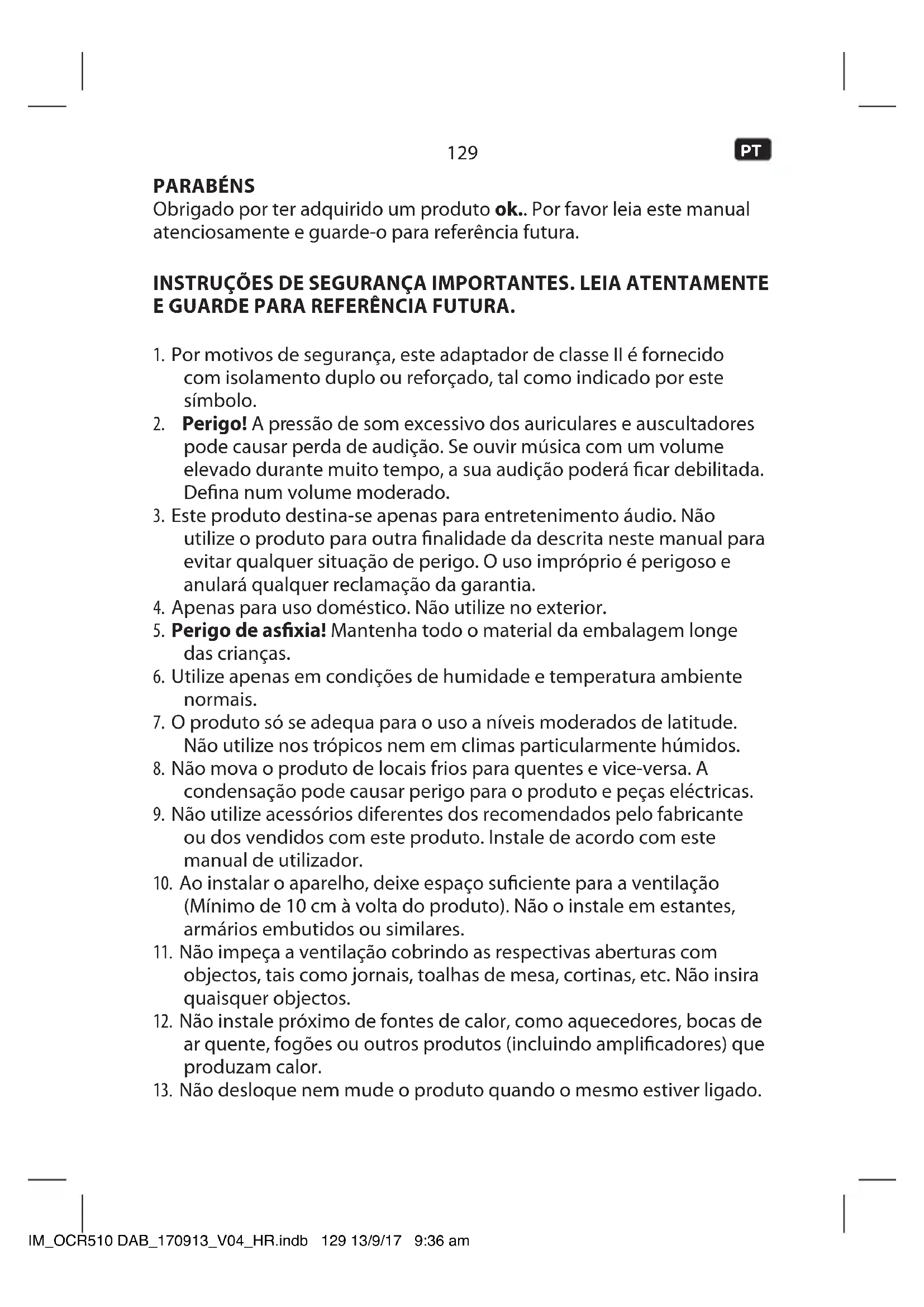 Entrada : 6 V 0,5 A Consumo de energia em funcionamento : 3 W Consumo de energie em espera : < 1 W Banda de sintonização (Sintonizador DAB) : 174 - 240 MHz Banda de sintonização (Sintonizador FM) : 87,5 - 108 MHz Grelha de sintonização (Sintonizador FM) : 0,05 MHz Dimensões (L x A x P) : 100 x 113 x 100 mm Peso : Aprox. 0,9 kg ELIMINAÇÃO Não elimine este aparelho como lixo municipal não escolhido. Devolva-o a um ponto de recolha designado de reciclagem de REEE. Ao fazê-lo, irá ajudar a conservar os recursos e a proteger o ambiente. Contacte o seu revendedor ou as autoridades locais para obter mais informações. IM_OCR510 DAB_170913_V04_HR.indb 142 13/9/17 9:36 am143