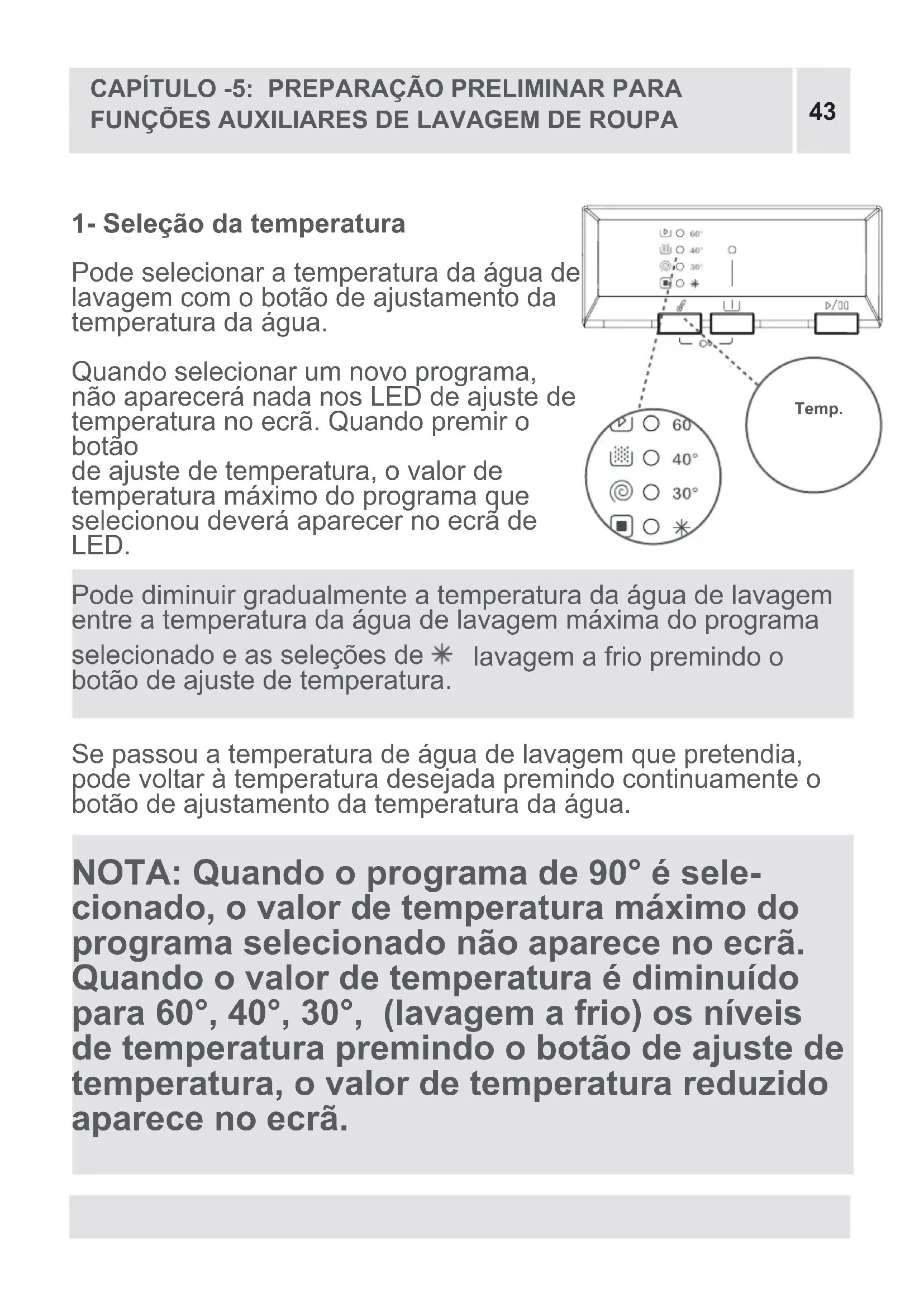 Podeselecionaratemperaturadaáguade lavagemcomobotãodeajustamentoda temperaturadaágua. Quandoselecionarumnovoprograma, nãoapareceránadanosLEDdeajustede temperaturanoecrã.Quandopremiro botão deajustedetemperatura,ovalorde temperaturamáximodoprogramaque selecionoudeveráaparecernoecrãde LED. Podediminuirgradualmenteatemperaturadaáguadelavagem entreatemperaturadaáguadelavagemmáximadoprograma selecionadoeasseleçõesde lavagemafriopremindoo botãodeajustedetemperatura. Sepassouatemperaturadeáguadelavagemquepretendia, podevoltaràtemperaturadesejadapremindocontinuamenteo botãodeajustamentodatemperaturadaágua. NOTA: Quando o programa de 90° é sele- cionado, o valor de temperatura máximo do programa selecionado não aparece no ecrã. Quando o valor de temperatura é diminuído para 60°, 40°, 30°, (lavagem a frio) os níveis de temperatura premindo o botão de ajuste de temperatura, o valor de temperatura reduzido aparece no ecrã. Temp.44 CAPÍTULO -5: PREPARAÇÃO PRELIMINAR PARA FUNÇÕES AUXILIARES DE LAVAGEM DE ROUPA