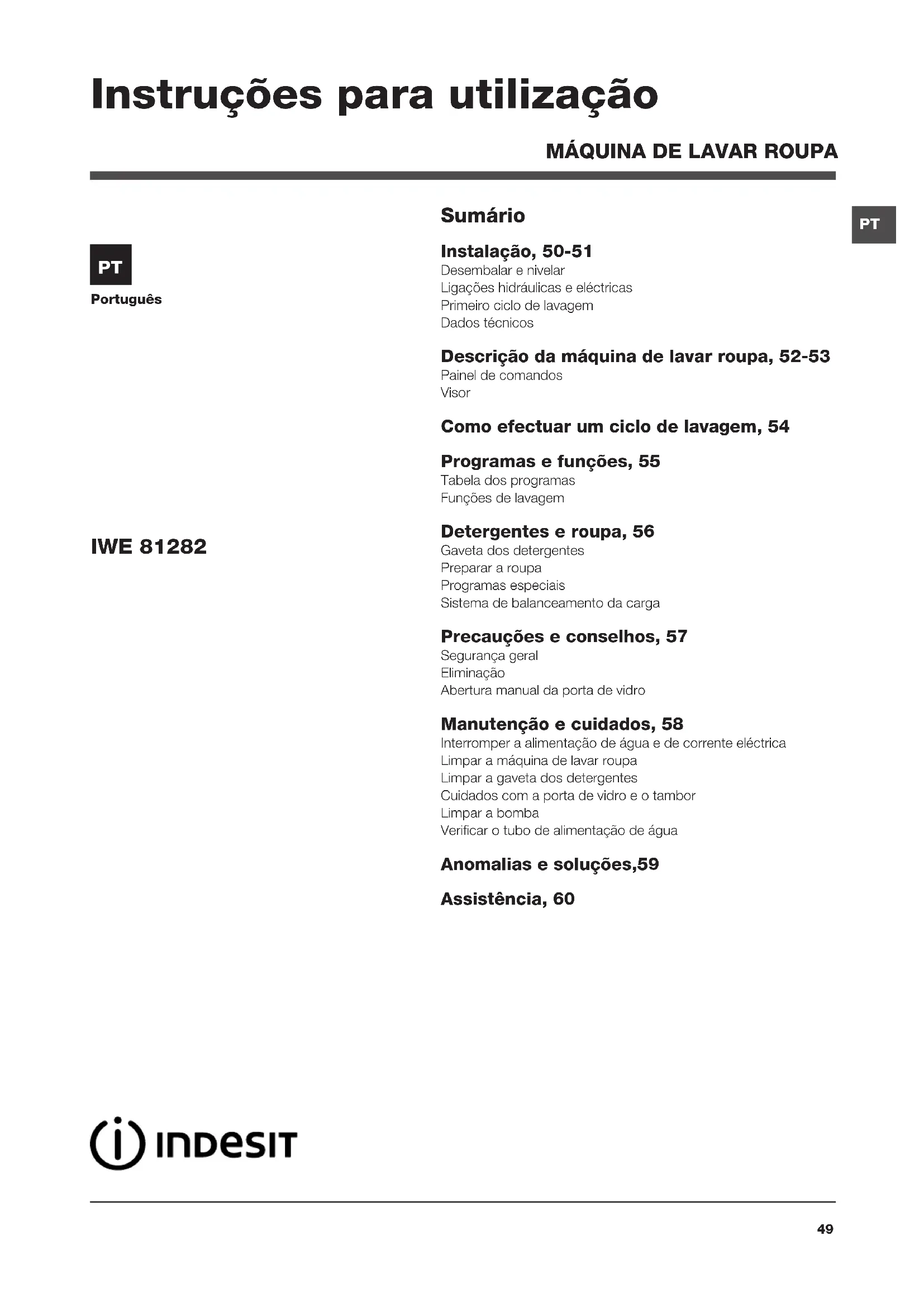 Português Sumário Instalação, 50-51 Desembalar e nivelar Ligações hidráulicas e eléctricas Primeiro ciclo de lavagem Dados técnicos Descrição da máquina de lavar roupa, 52-53 Painel de comandos Visor Como efectuar um ciclo de lavagem, 54 Programas e funções, 55 Tabela dos programas Funções de lavagem Detergentes e roupa, 56 Gaveta dos detergentes Preparar a roupa Programas especiais Sistema de balanceamento da carga Precauções e conselhos, 57 Segurança geral Eliminação Abertura manual da porta de vidro Manutenção e cuidados, 58 Interromper a alimentação de água e de corrente eléctrica Limpar a máquina de lavar roupa Limpar a gaveta dos detergentes Cuidados com a porta de vidro e o tambor Limpar a bomba Verificar o tubo de alimentação de água Anomalias e soluções,59 Assistência, 60