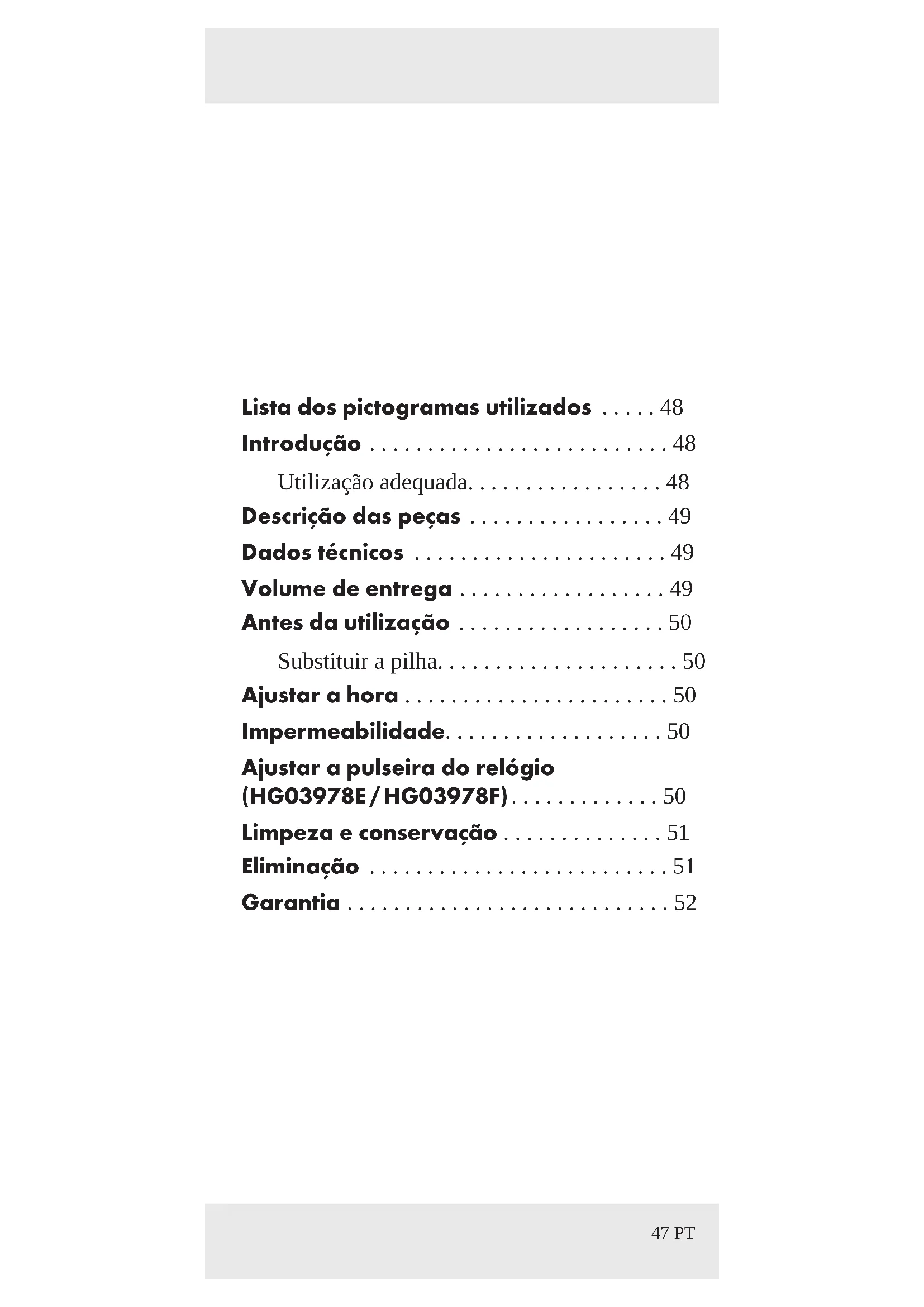 Placa de bloqueio (HG03978E / HG03978F) Dados técnicos Pilha: 1 x 1,5 V Pilha tipo botão (Tipo SR621SW) Número de modelo: HG03978A: Bracelete de relógio em amarelo dourado, preto HG03978B: Bracelete de relógio em rosa dourada, branco HG03978C: Bracelete de relógio prateado, cinzento HG03978D: Bracelete de relógio em rosa dourada, burgundy HG03978E: Prateado, bracelete de relógio em metal Milanese HG03978F: Rosa dourada, bracelete de relógio em rosa dourada Volume de entrega Ao desembalar, verifique a integridade do conteúdo e a existência de eventuais danos do produto e de todas as peças. 1 Relógio de pulso 1 Pilha (já colocada) 1 Manual de instruções50 PT Antes da utilização Elimine todo o material de embalagem do produto. Substituir a pilha Nota: Consulte uma loja especializada para substituir as pilhas. Ajustar a hora