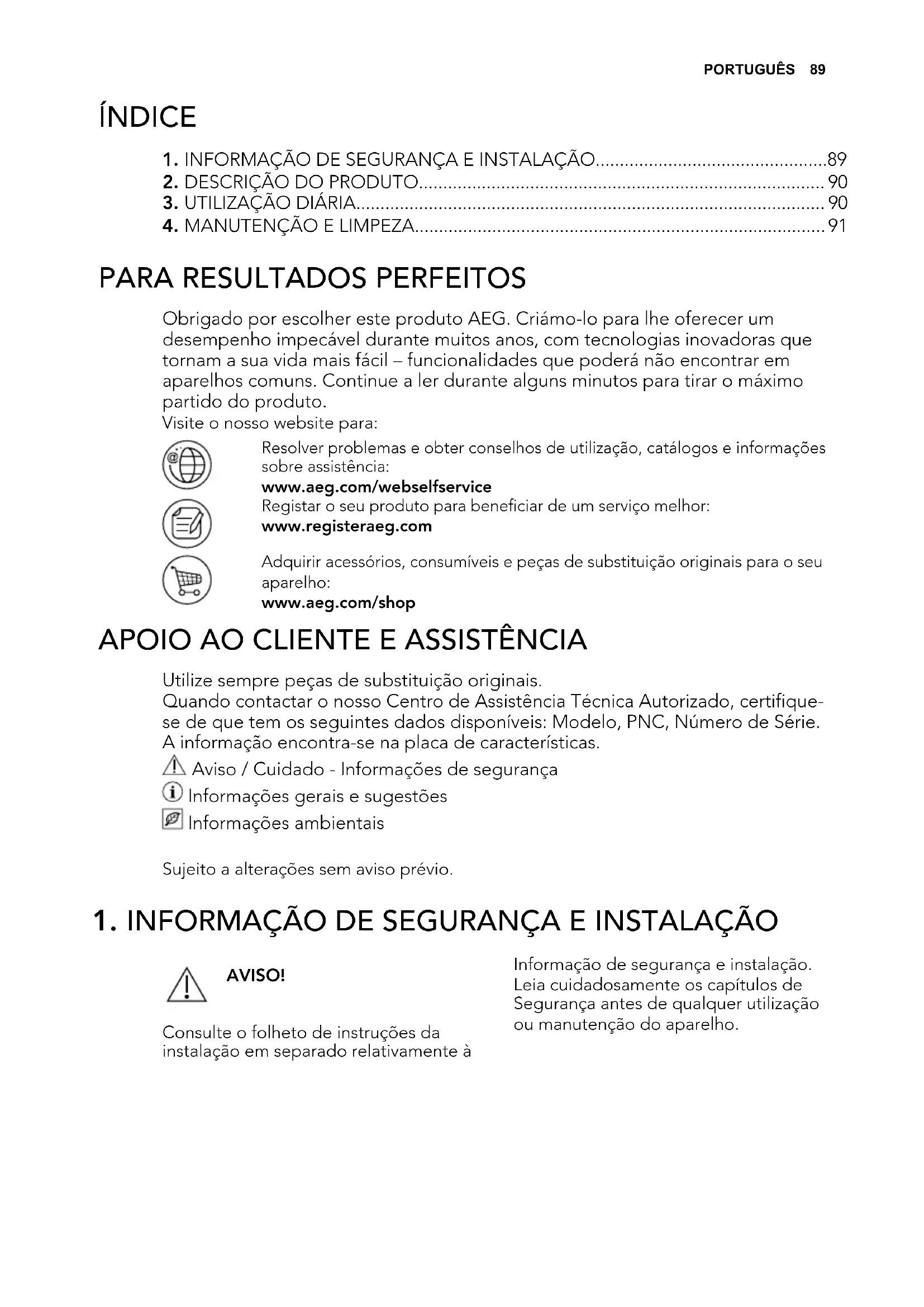 Obrigado por escolher este produto AEG. Criámo-lo para lhe oferecer um desempenho impecável durante muitos anos, com tecnologias inovadoras que tornam a sua vida mais fácil – funcionalidades que poderá não encontrar em aparelhos comuns. Continue a ler durante alguns minutos para tirar o máximo partido do produto. Visite o nosso website para: Resolver problemas e obter conselhos de utilização, catálogos e informações sobre assistência: www.aeg.com/webselfservice Registar o seu produto para beneficiar de um serviço melhor: www.registeraeg.com Adquirir acessórios, consumíveis e peças de substituição originais para o seu aparelho: www.aeg.com/shop