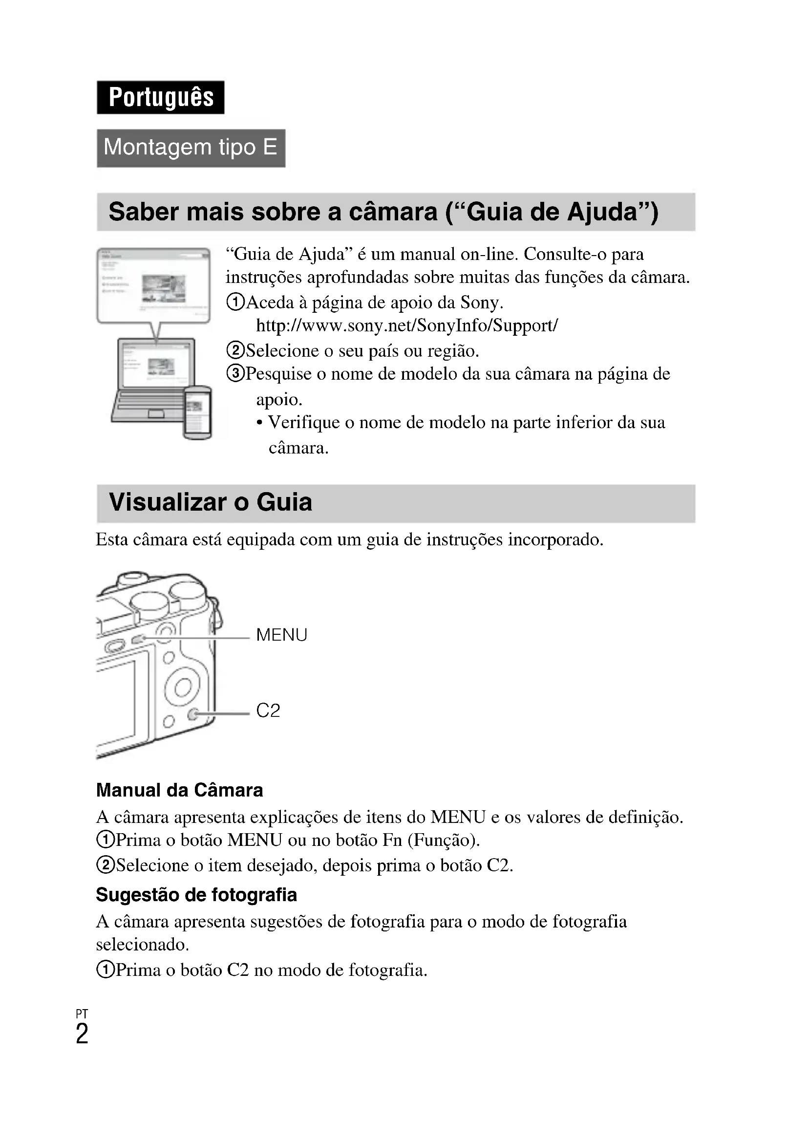 Esta câmara está equipada com um guia de instruções incorporado. Manual da Câmara A câmara apresenta explicações de itens do MENU e os valores de definição. 1 Prima o botão MENU ou no botão Fn (Função). 2 Selecione o item desejado, depois prima o botão C2. Sugestão de fotografia A câmara apresenta sugestões de fotografia para o modo de fotografia selecionado. 1 Prima o botão C2 no modo de fotografia. Português Montagem tipo E Saber mais sobre a câmara (“Guia de Ajuda”) “Guia de Ajuda” é um manual on-line. Consulte-o para instruções aprofundadas sobre muitas das funções da câmara. 1 Aceda à página de apoio da Sony. http://www.sony.net/SonyInfo/Support/ 2 Selecione o seu país ou região. 3 Pesquise o nome de modelo da sua câmara na página de apoio.