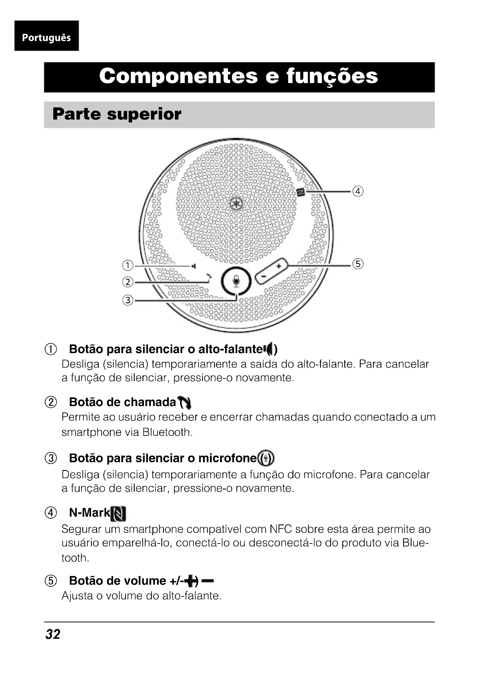 Português33 Porta para fone de ouvido ( ) Conecta um fone de ouvido comercial ao produto. Porta USB ( ) Conecta um computador ou um adaptador de energia USB comercial ao produto através do cabo USB fornecido. Botão de alimentação ( ) Liga o produto quando pressionado por mais de 2 segundos. Desliga o produto quando pressionado novamente por mais de 2 segundos. Indicador de bateria ( ) Pisca quando a bateria recarregável embutida estiver fraca. Indica o nível restante da bateria quando o botão for pressionado. Botão Bluetooth ( ) Permite que o usuário emparelhe o produto a um smartphone, ou ainda conecte ou desconecte o produto de um smartphone via Bluetooth. Indicador de Bluetooth ( ) Indica o status da conexão Bluetooth. Para obter mais informações, consulte o Guia do usuário no endereço a seguir: https://manual.yamaha.com/uc/yvc-200/ Lateral ④⑤①③②⑥34 Use o cabo USB fornecido para transmitir energia e começar a carregar. A energia pode ser transmitida conectando o produto a um computador ou a um adaptador de alimentação USB comercial. Pressione o botão liga/desliga ( ) por mais de 2 segundos para ligar o produto. Carregar a bateria Ligar/desligar o produto Adaptador de energia USB (comercial) Conectar a uma tomada AC Computador Conectar a uma porta USB35 1 Pressione o botão Bluetooth ( ) por mais de 2 segundos. O produto entra no modo de espera de emparelhamento quando o indica- dor de Bluetooth começar a piscar rapidamente. 2 Emparelhe o produto com um smartphone. Ative o Bluetooth no smartphone para que possa ser conectado e empa- relhe-o com o “YVC-200 Yamaha”. Se for necessário inserir uma senha, digite “0000”. Conectar a um smartphone via Bluetooth Emparelhamento Smartphone36 Pressionar o botão Bluetooth ( ) conecta o produto com o último smartphone emparelhado ou conectado. Segurar um smartphone com compatibilidade NFC sobre a N-Mark ( ) per- mite ao usuário emparelhá-lo e conectá-lo ao produto via Bluetooth de forma simultânea. Para obter mais informações, consulte o Guia do usuário no endereço a seguir: https://manual.yamaha.com/uc/yvc-200/ 1 Conecte o produto ao computador. Conecte o produto ao computador usando o cabo USB fornecido. O produto será iniciado automaticamente à medida que a energia for transmitida a partir do computador. 2 Configure as definições de som com o computador. Selecione “Yamaha YVC-200” nas configurações de som do computador (microfone e alto-falante). Conexão a um smartphone emparelhado Emparelhamento/conexão via NFC Conexão com um computador via USB Conectar a uma porta USB Computador37 Especificações Alimentação: USB bus power, adaptador de alimentação USB (comercial) Bateria recarregável: Tipo: Bateria de íon-lítio Temperatura de carregamento: 0 a 40ºC Tempo de uso contínuo: aproximadamente 10 horas Consumo de energia (máx.): 2,5 W Interface: USB 2.0 Full Speed, Bluetooth, NFC (Near Field Communication), tomada de fone de ouvido de 3,5 mm Dispositivos conectáveis: USB: Computador com Windows ou MacOS Bluetooth: Smartphone com Android ou iOS Bluetooth: Versão: 4.2 Perfis suportados: HFP (1.6), A2DP Codec suportado: SBC, mSBC, CVSD Saída sem fio: Classe 2 Distância máxima de comunicação: 10 m (sem interferência) Radiofrequência (frequência operacional): 2.402 a