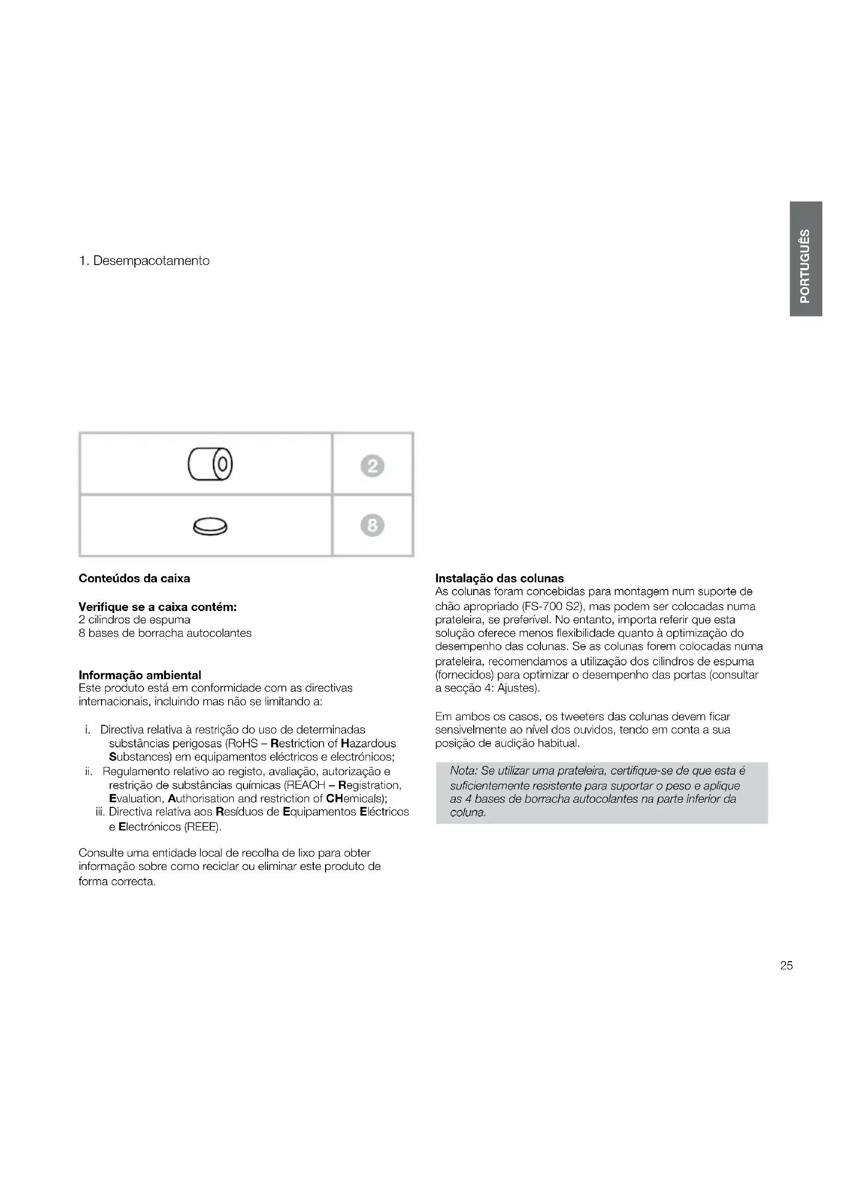 Conteúdos da caixa Verique se a caixa contém: 2 cilindros de espuma 8 bases de borracha autocolantes Informação ambiental Este produto está em conformidade com as directivas internacionais, incluindo mas não se limitando a: